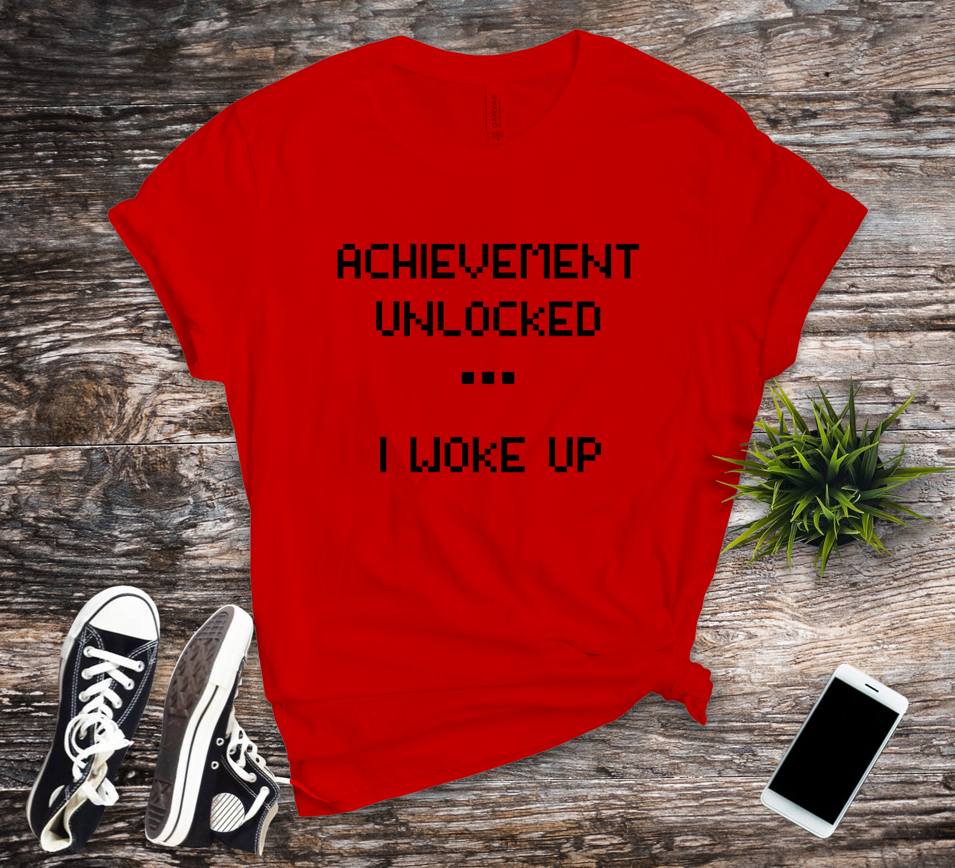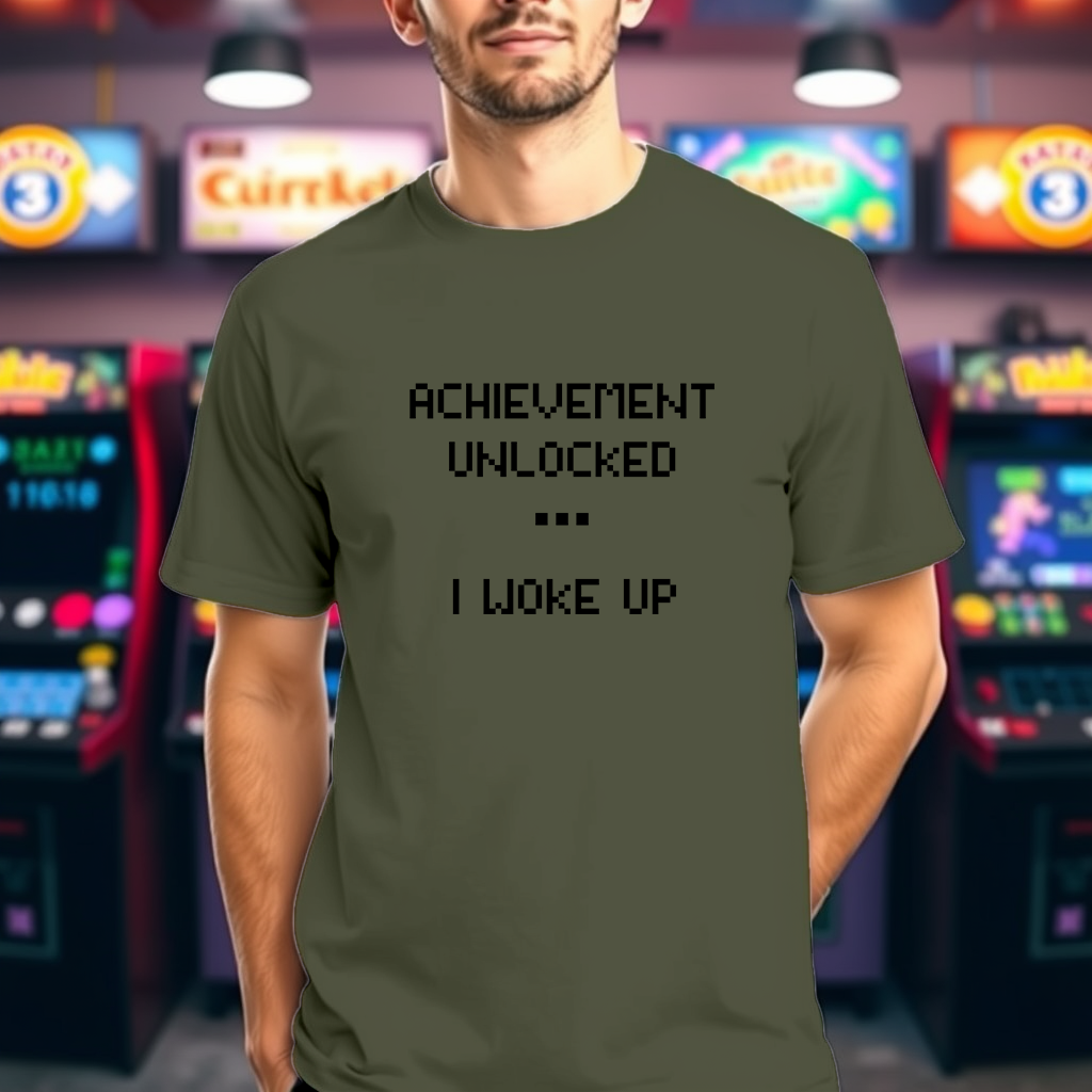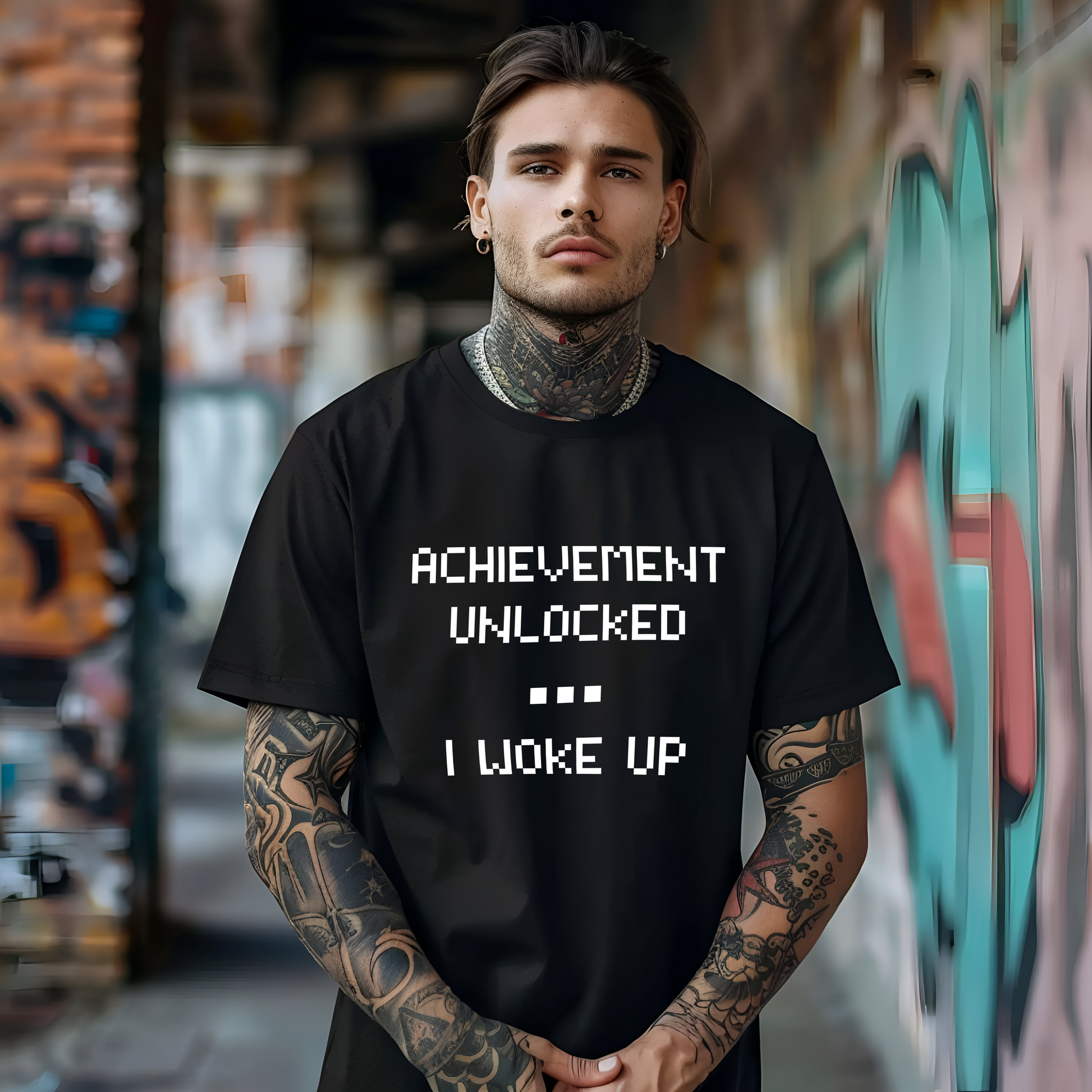 Level up your wardrobe with our "Achievement Unlocked ... I Woke Up" t-shirt, designed especially for the gaming community. This tee is perfect for those who love retro vibes and video games, combining humor with nostalgia. The text is styled in a classic video game font, reminiscent of your favorite 8-bit adventures, making it a must-have for any gamer who appreciates a good laugh and the satisfaction of achieving the ultimate goal—getting out of bed.