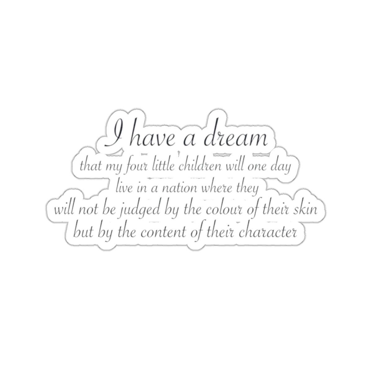 This sticker features a powerful quote from Martin Luther King Jr.'s iconic "I Have a Dream" speech, written in elegant cursive font. The quote reads: "I have a dream that my four little children will one day live in a nation where they will not be judged by the color of their skin but by the content of their character." The words are written in black ink, with the cursive script lending an air of sophistication and grace to the message.