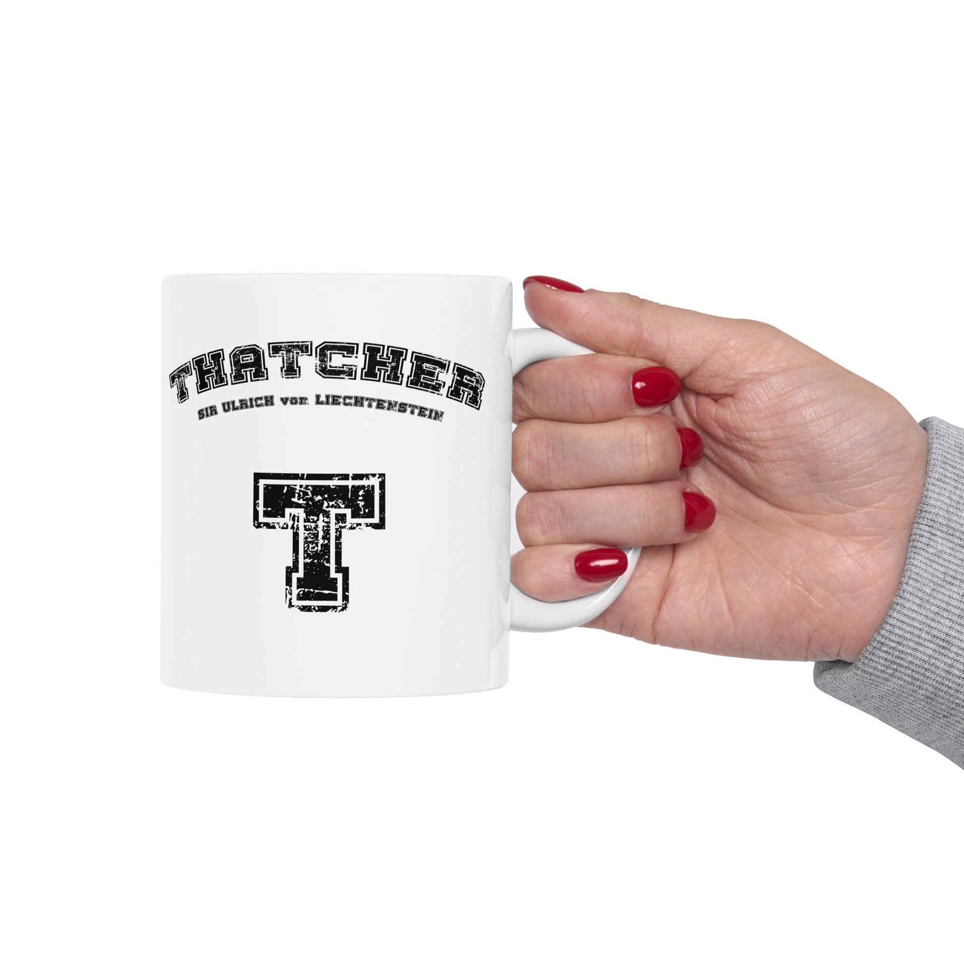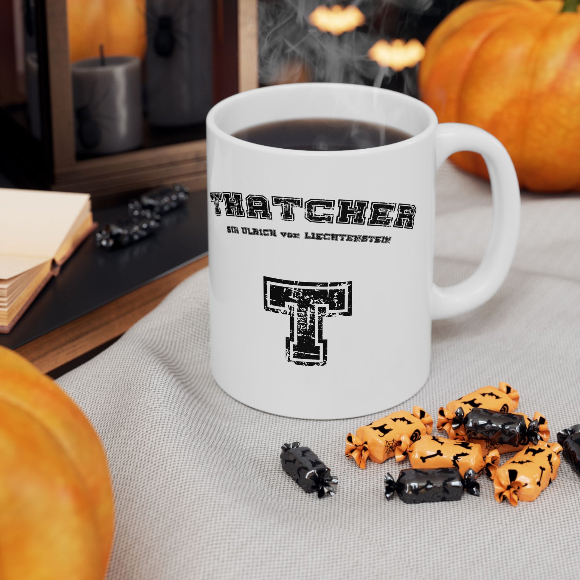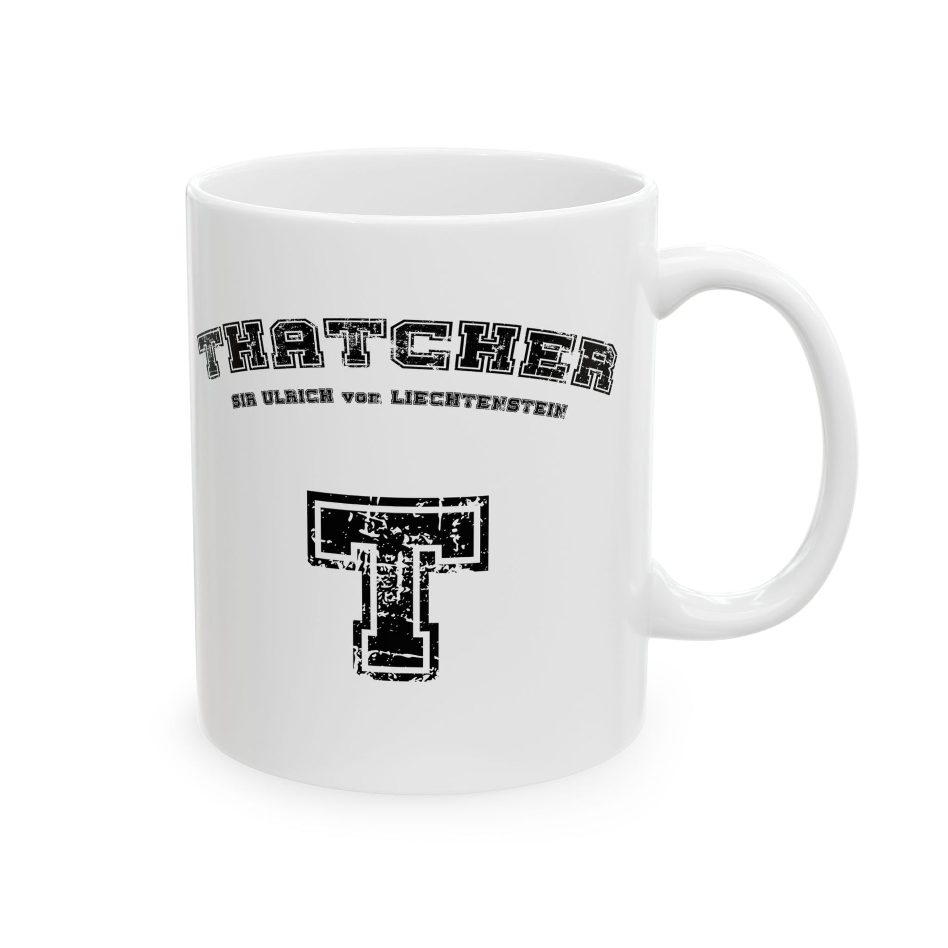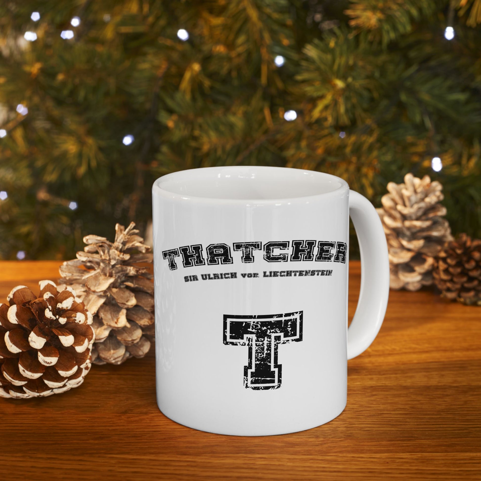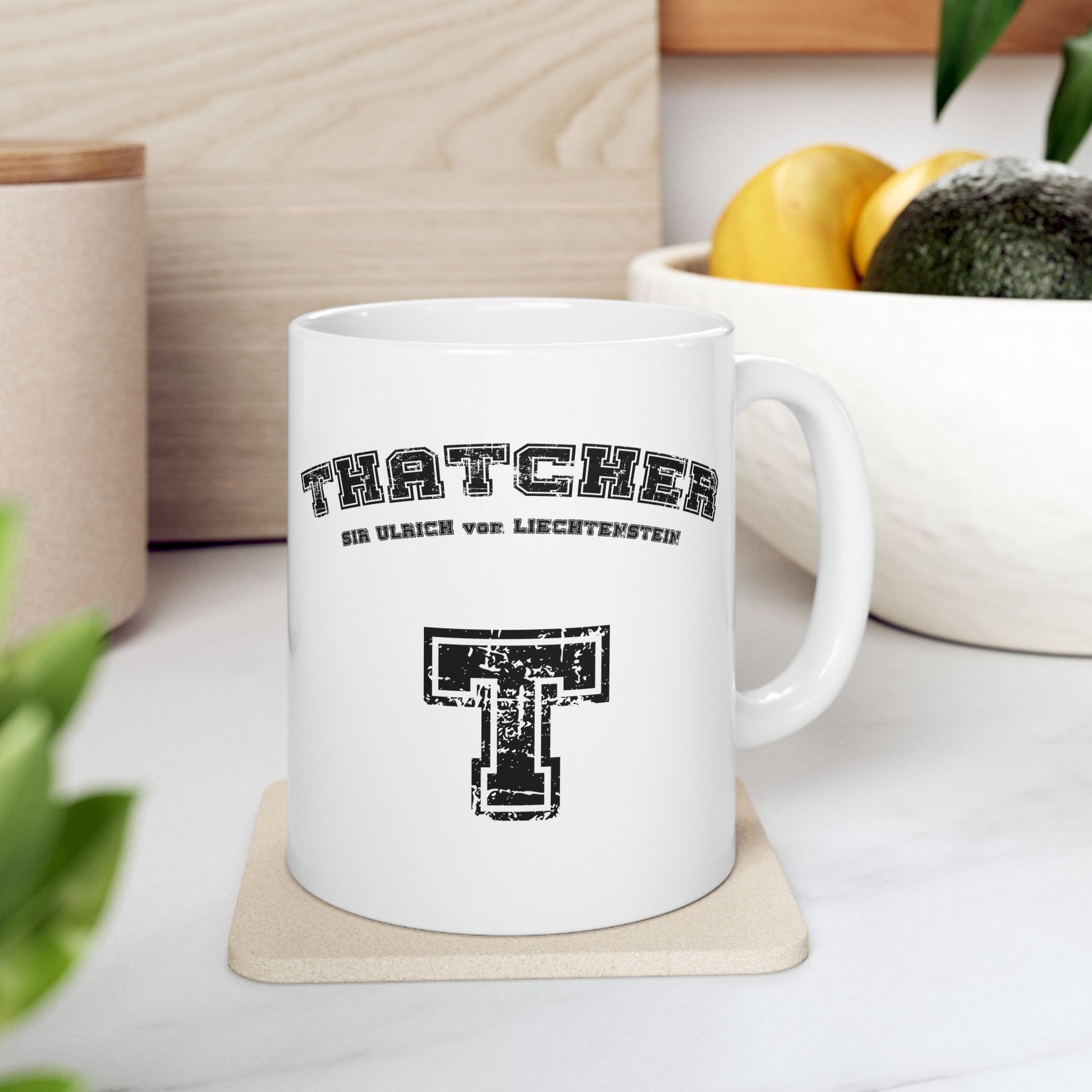 Behold, a mug fit for a true knight! With "It’s called a lance...hello!" on one side and Sir Ulrich von Liechtenstein's name under the true name of Thatcher, both above a varsity 'T'; on the other. This cup brings medieval wit to your morning brew. Perfect for jousting enthusiasts and Chaucer fans alike!