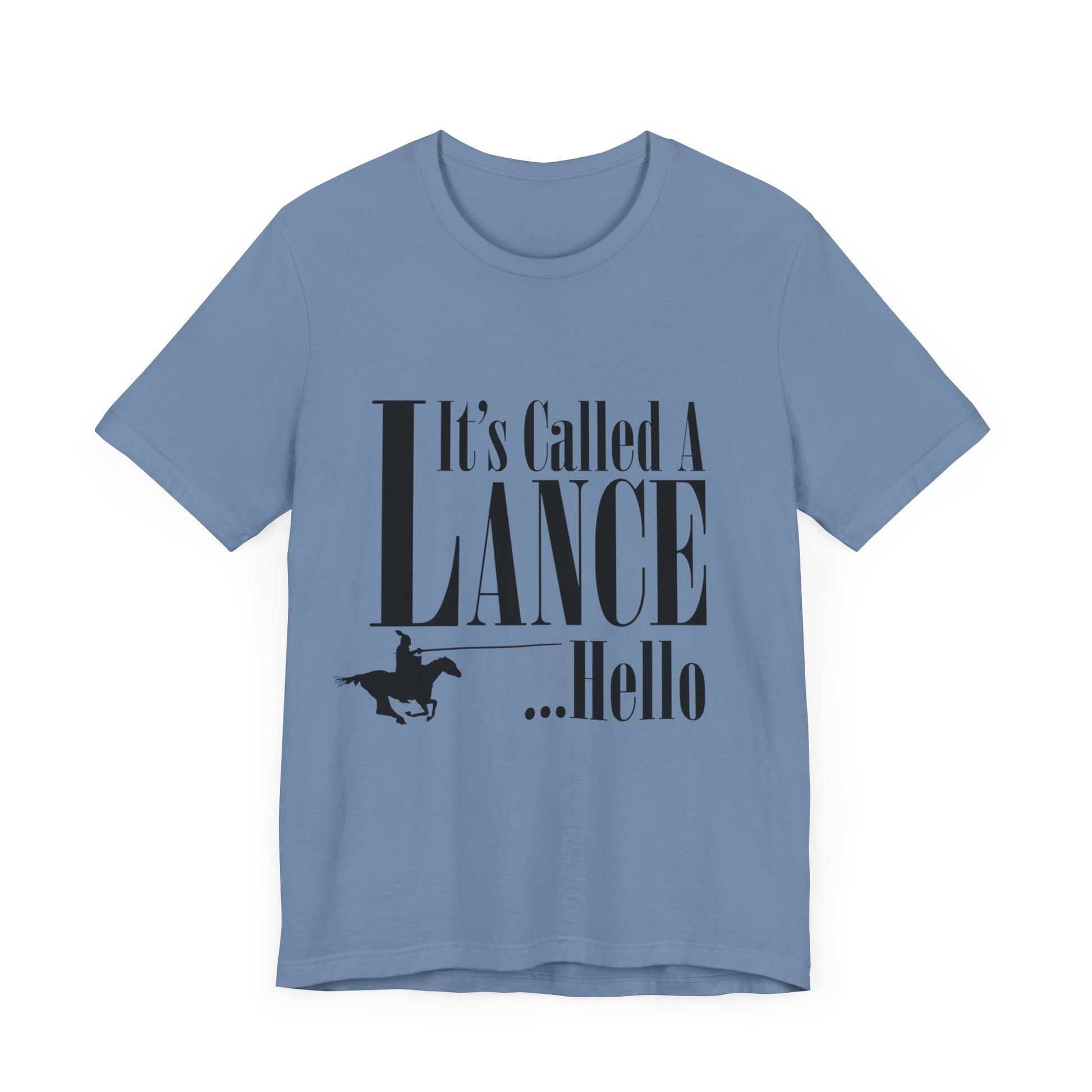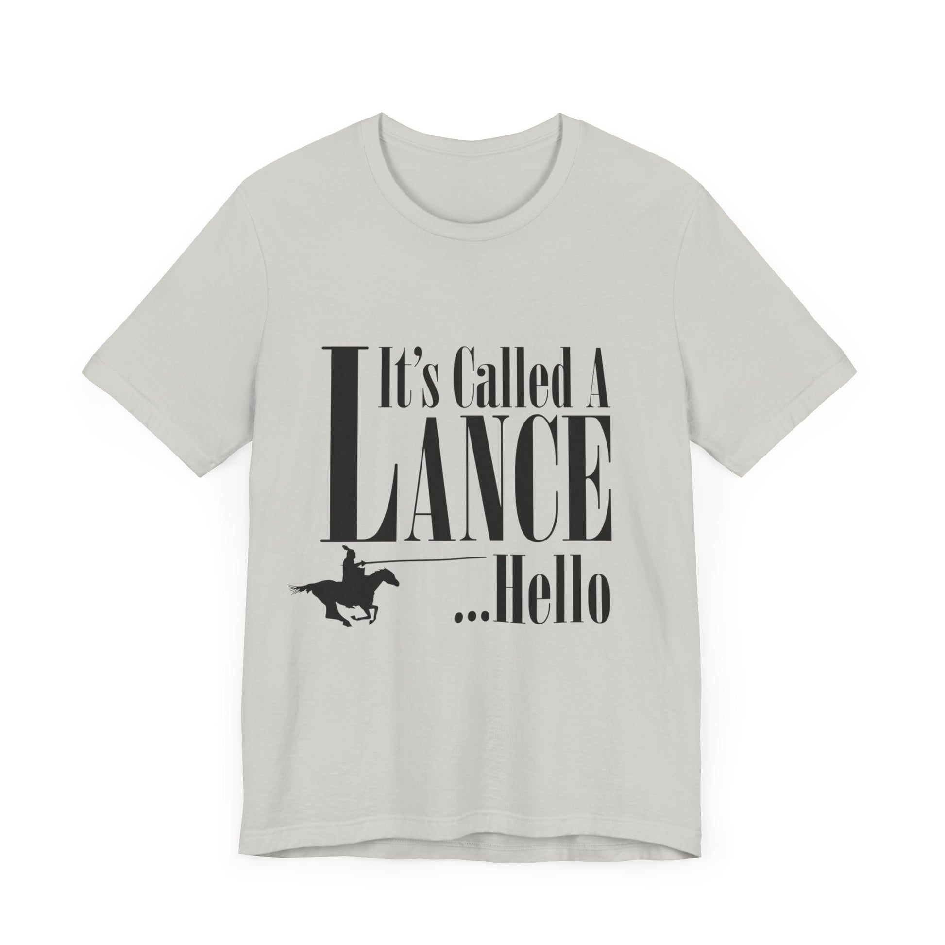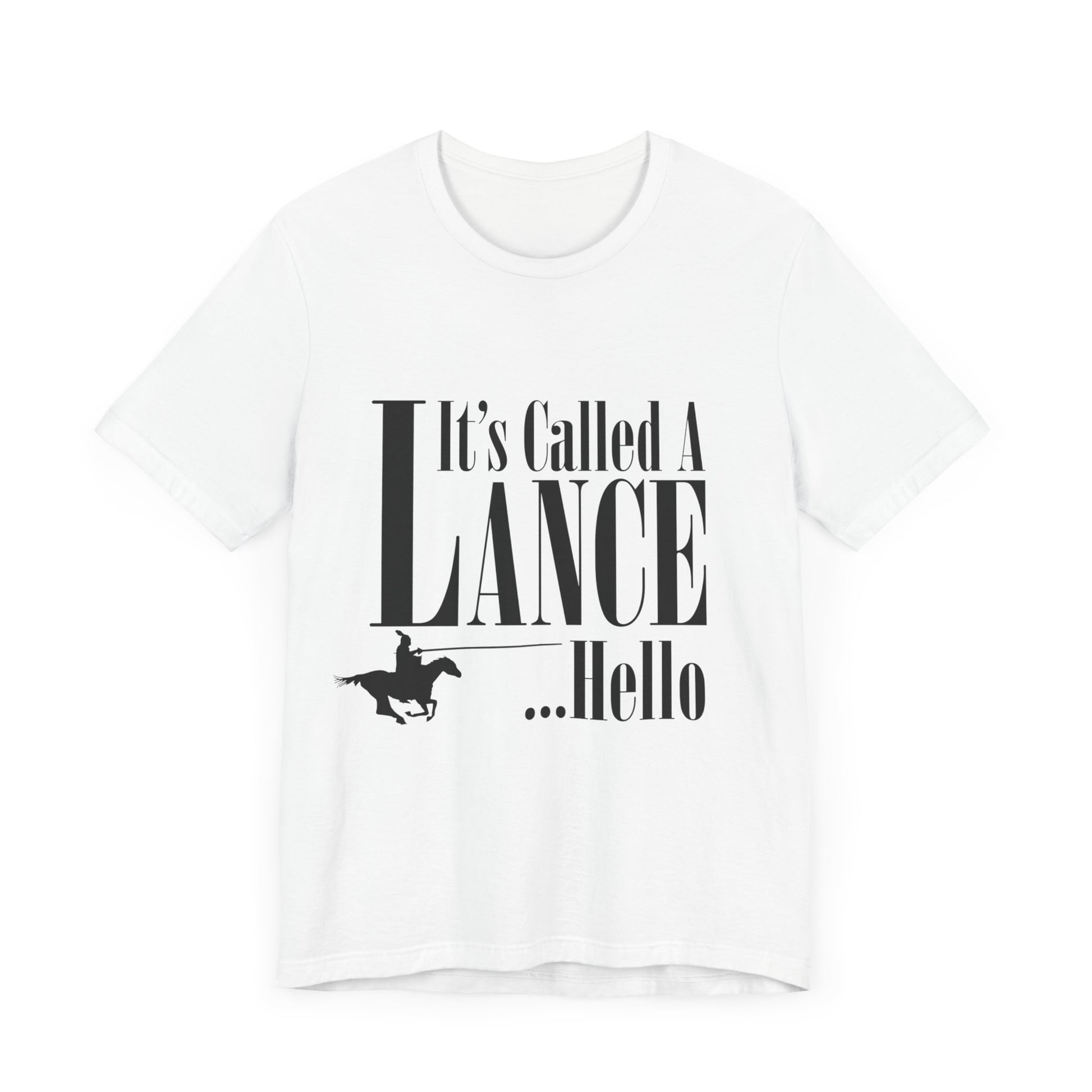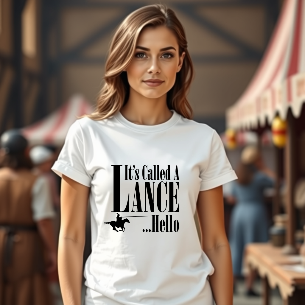 Behold, noble jesters and cinema connoisseurs! This "It's Called A Lance...Hello!" t-shirt is thy perfect garb for a day of mirth and merriment. Crafted for those who wield both wit and style, this short sleeve tee brings medieval humor to the modern age. Whether thou art off to a joust or simply wish to declare thy love for classic movie quotes, this shirt shall ensure thou art the talk of the realm.