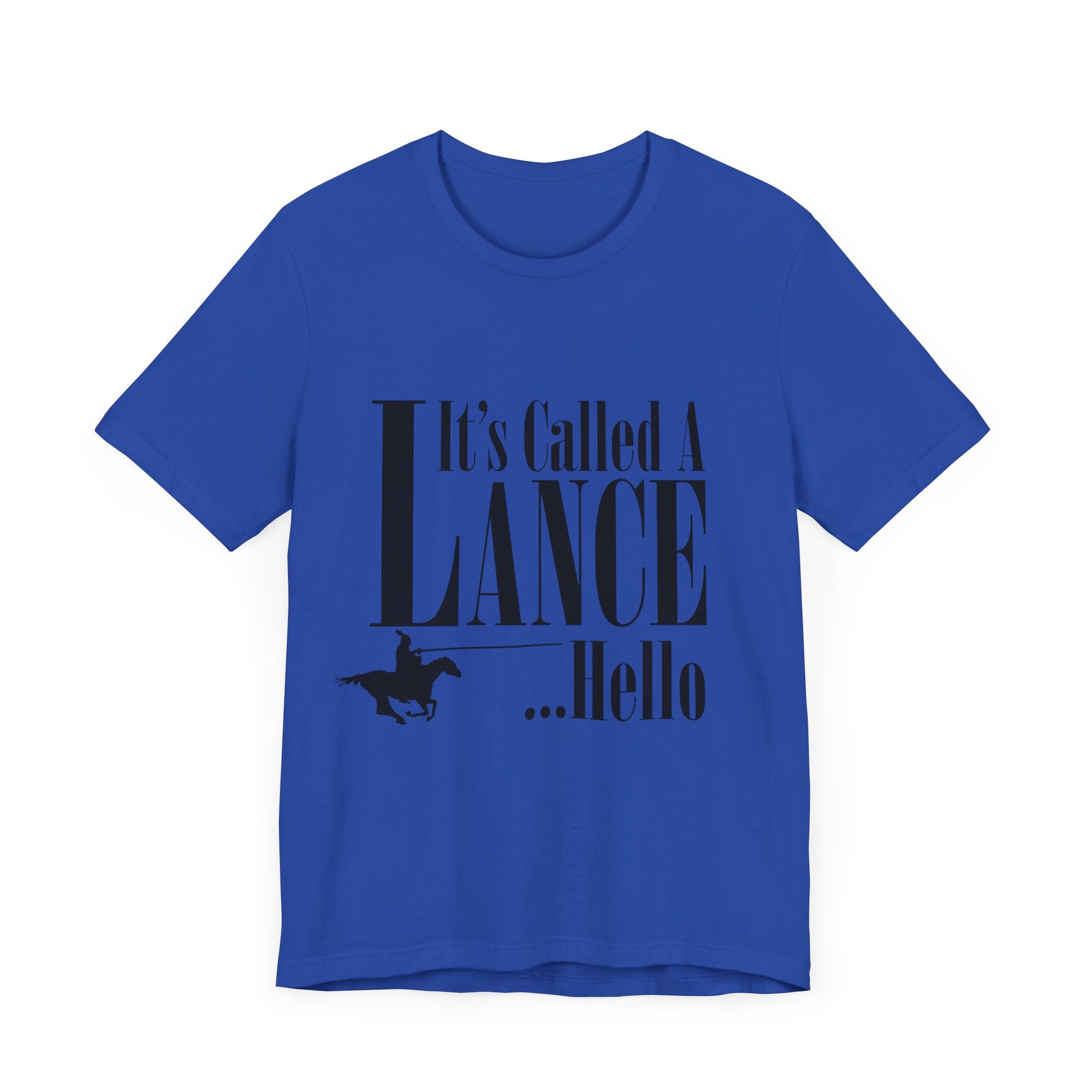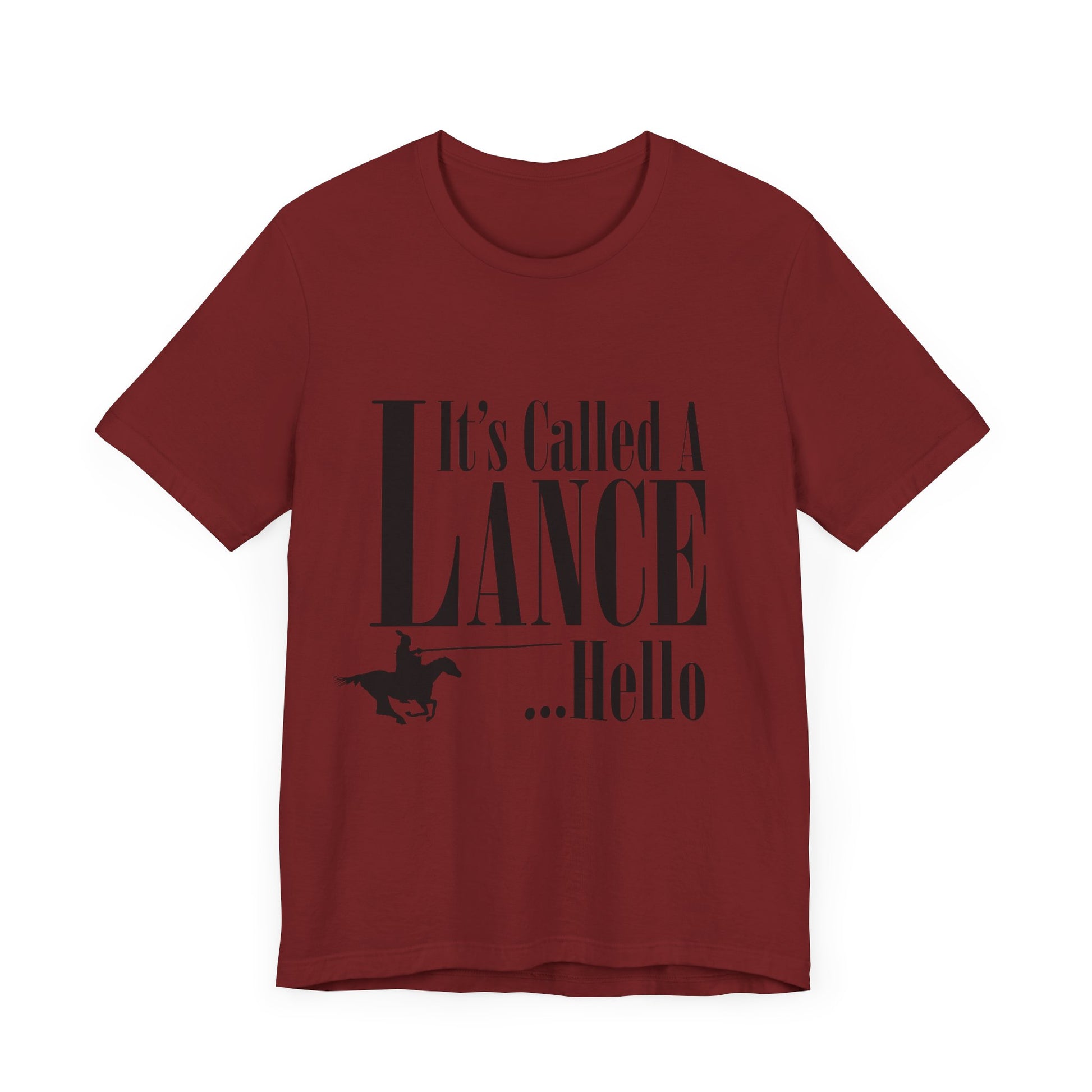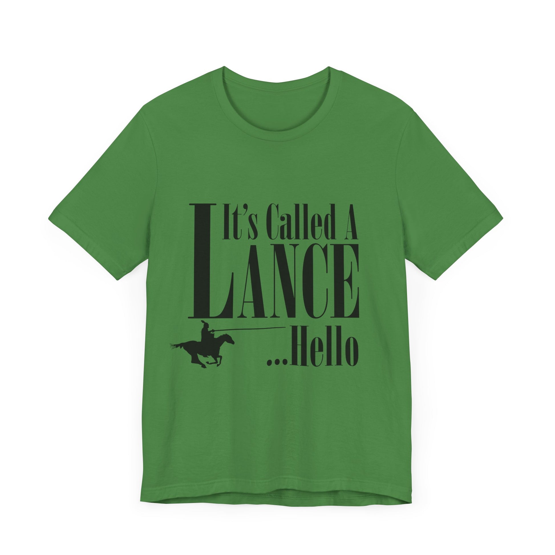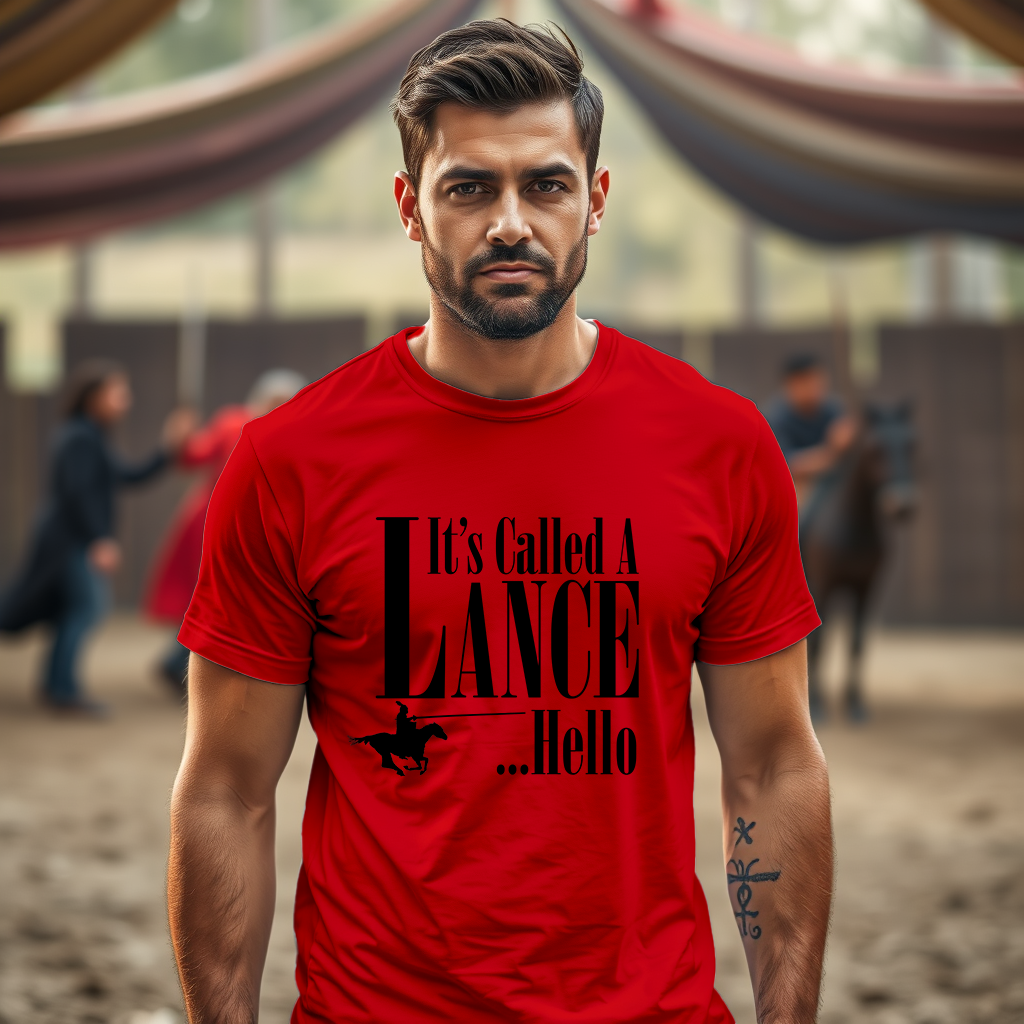 Behold, noble jesters and cinema connoisseurs! This "It's Called A Lance...Hello!" t-shirt is thy perfect garb for a day of mirth and merriment. Crafted for those who wield both wit and style, this short sleeve tee brings medieval humor to the modern age. Whether thou art off to a joust or simply wish to declare thy love for classic movie quotes, this shirt shall ensure thou art the talk of the realm.