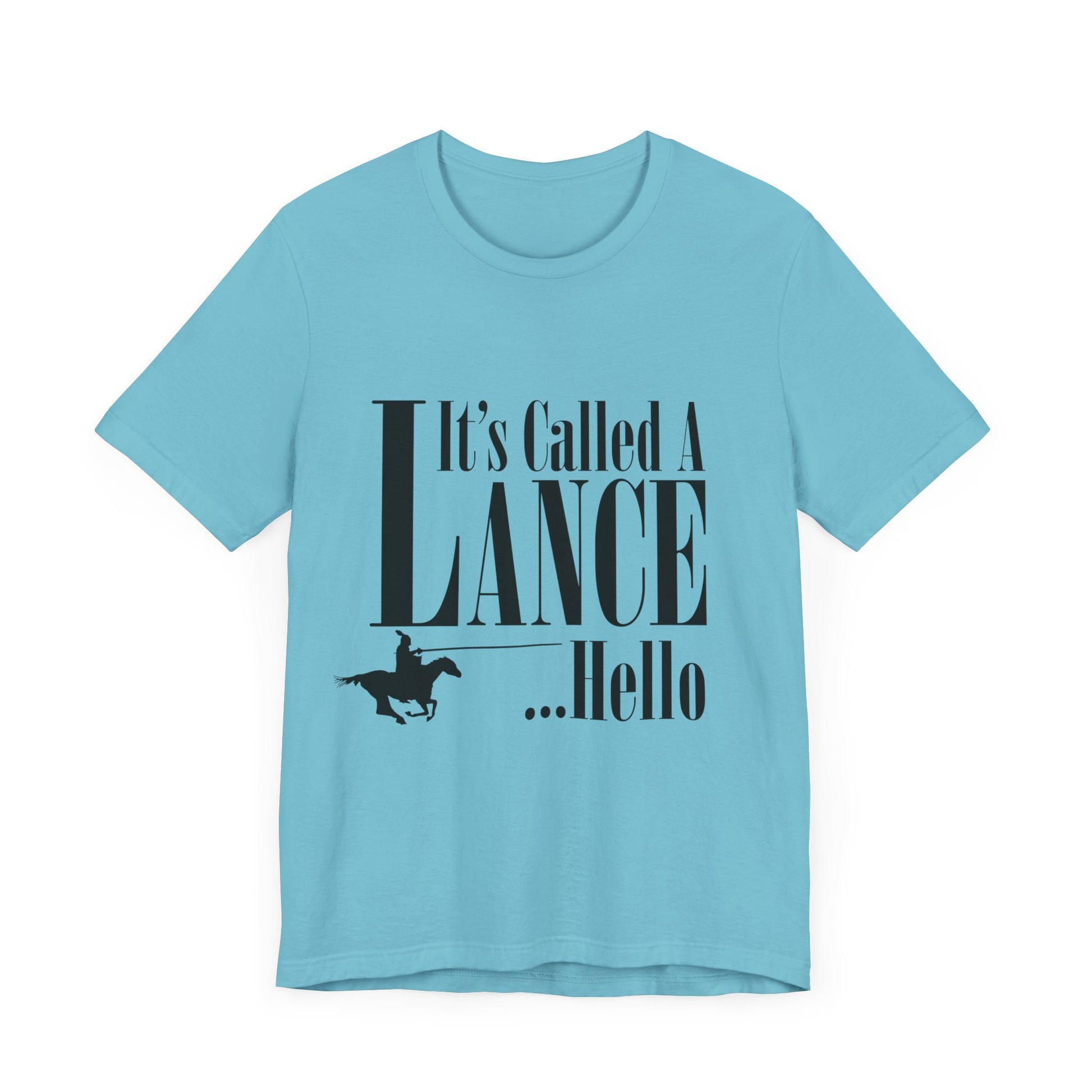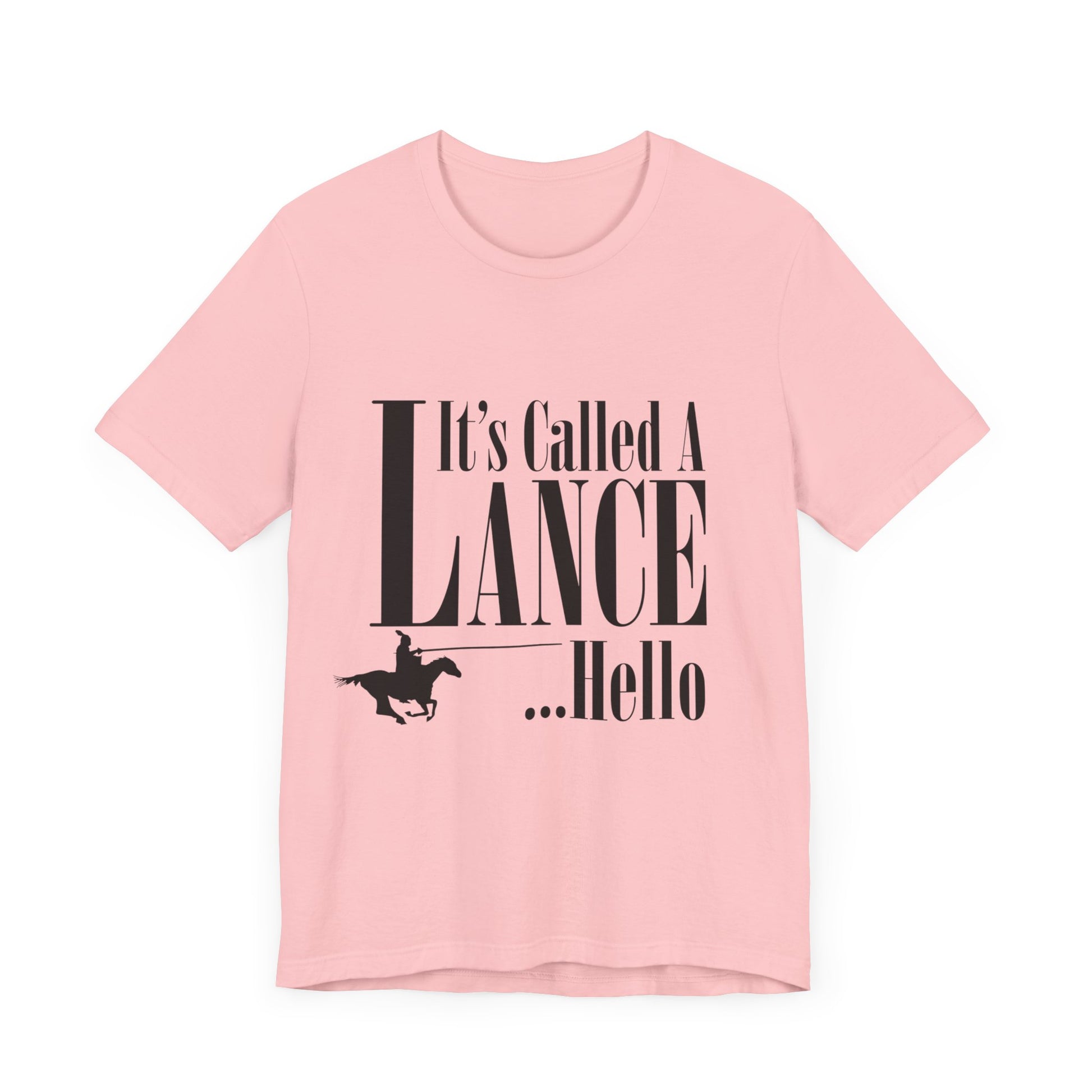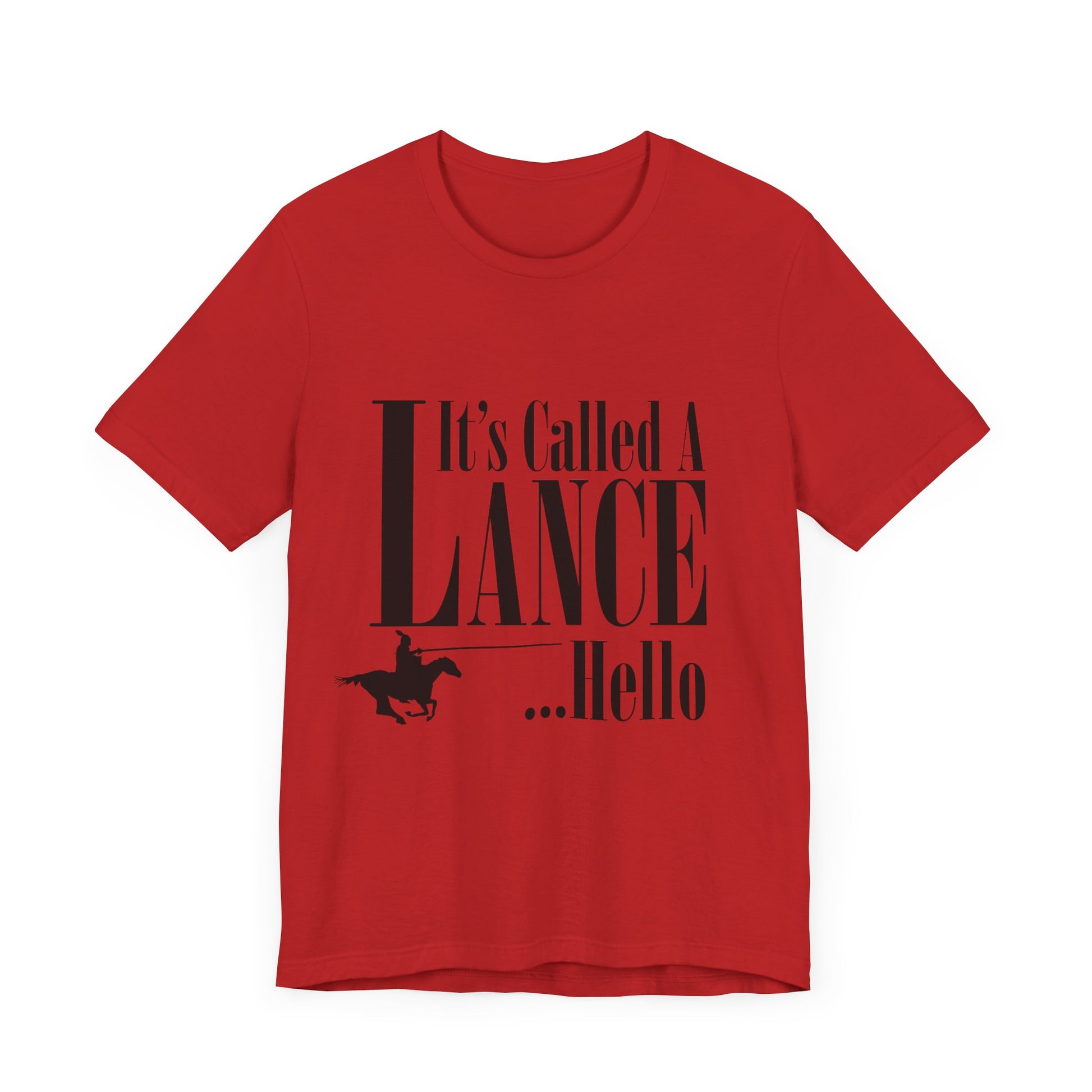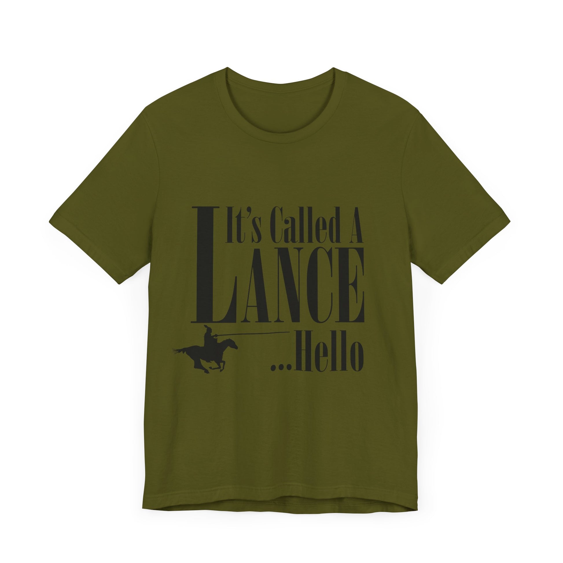Behold, noble jesters and cinema connoisseurs! This "It's Called A Lance...Hello!" t-shirt is thy perfect garb for a day of mirth and merriment. Crafted for those who wield both wit and style, this short sleeve tee brings medieval humor to the modern age. Whether thou art off to a joust or simply wish to declare thy love for classic movie quotes, this shirt shall ensure thou art the talk of the realm.