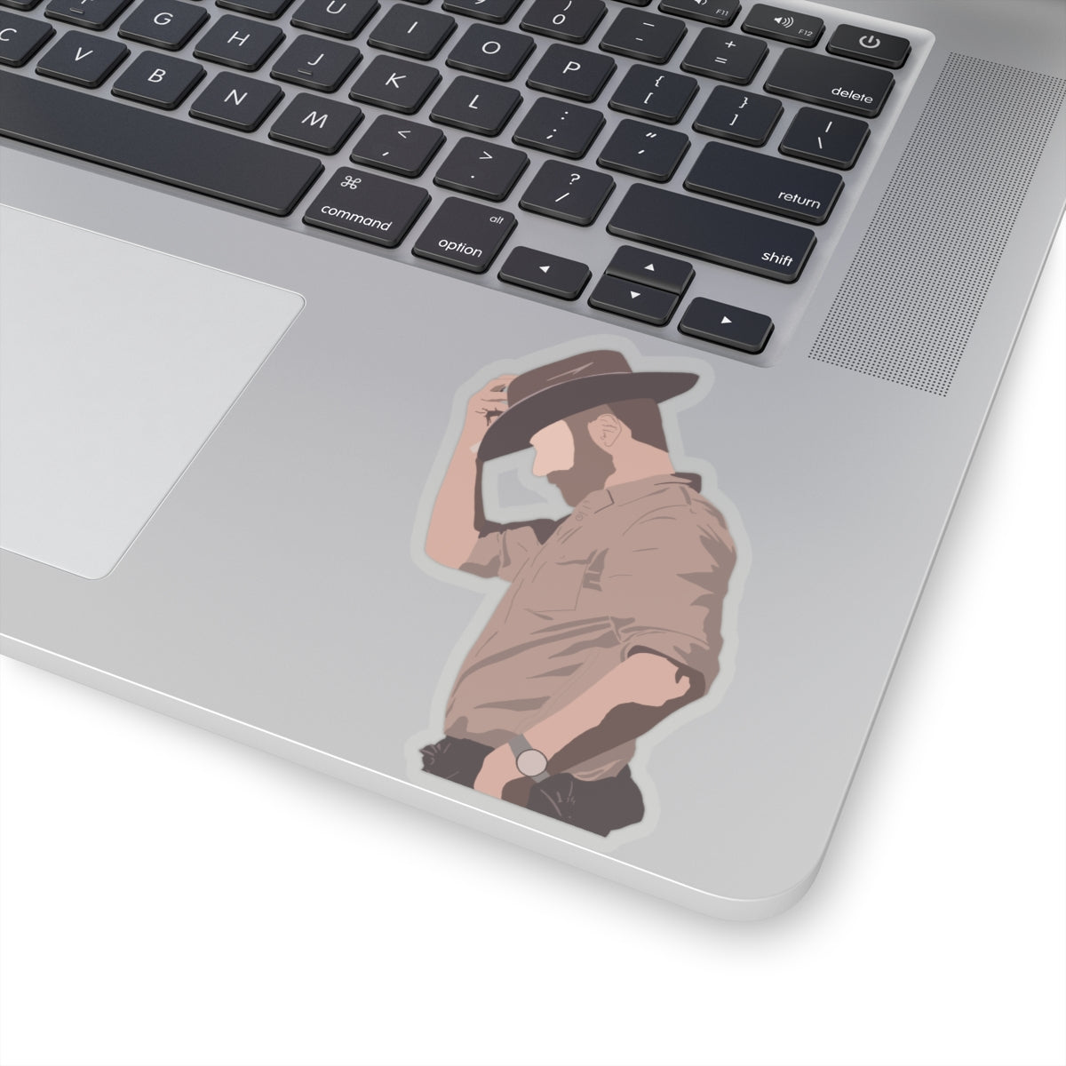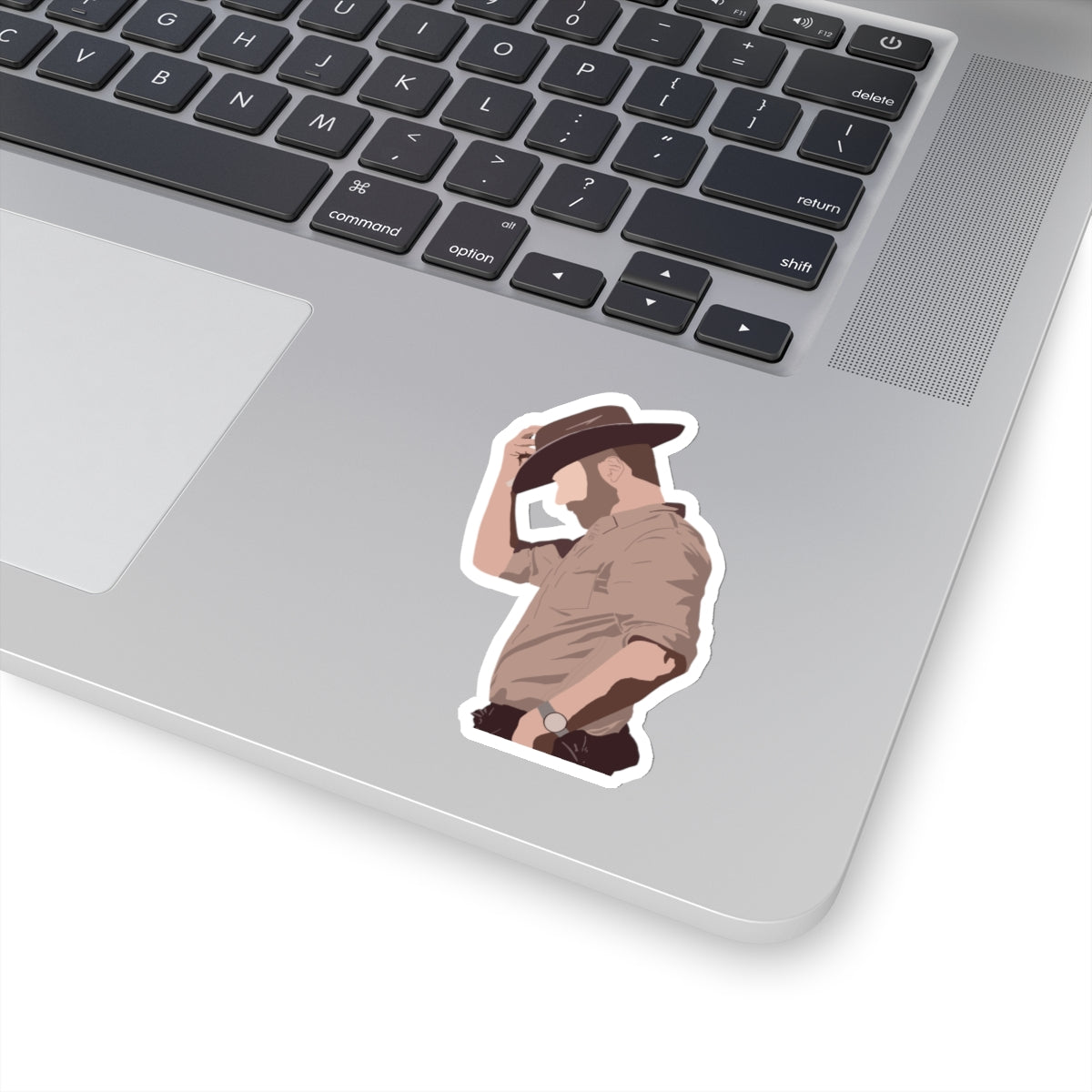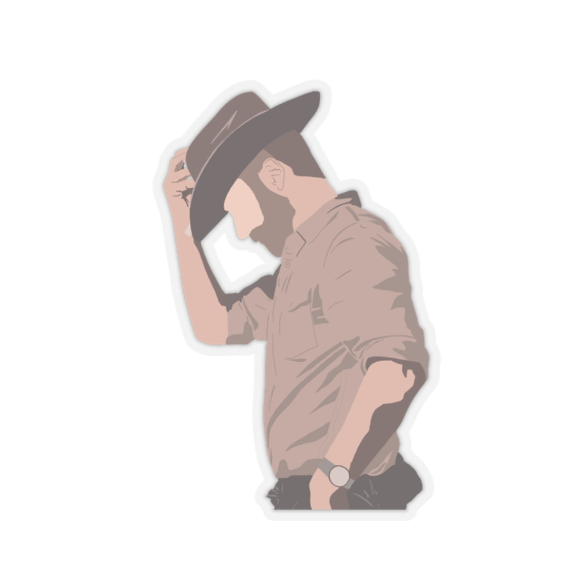 The sticker features a captivating drawing of a man in a sheriff uniform. The man's head is slightly lowered, conveying a sense of weariness and solemnity. The sheriff stands tall, donning a weathered cowboy hat that sits firmly on his head, shielding his eyes from the harsh environment. With his right hand, the sheriff holds onto his hat, as if lost in contemplation or mourning the world that once was. The posture of his body speaks of a life filled with challenges and hardships, yet he remains steadfast and determined.
