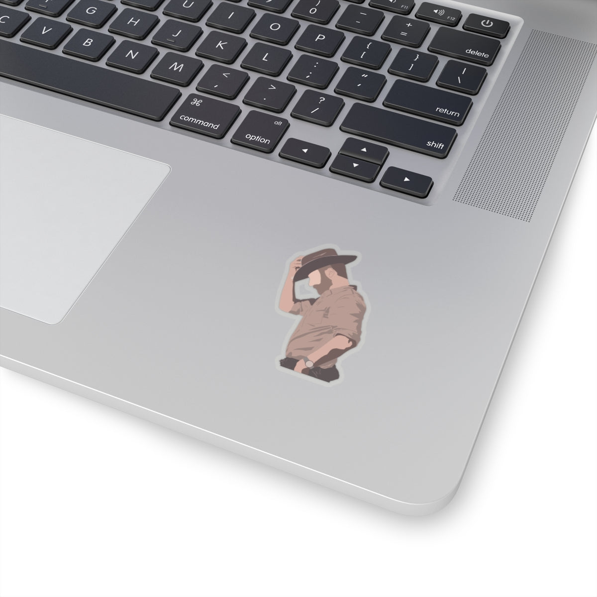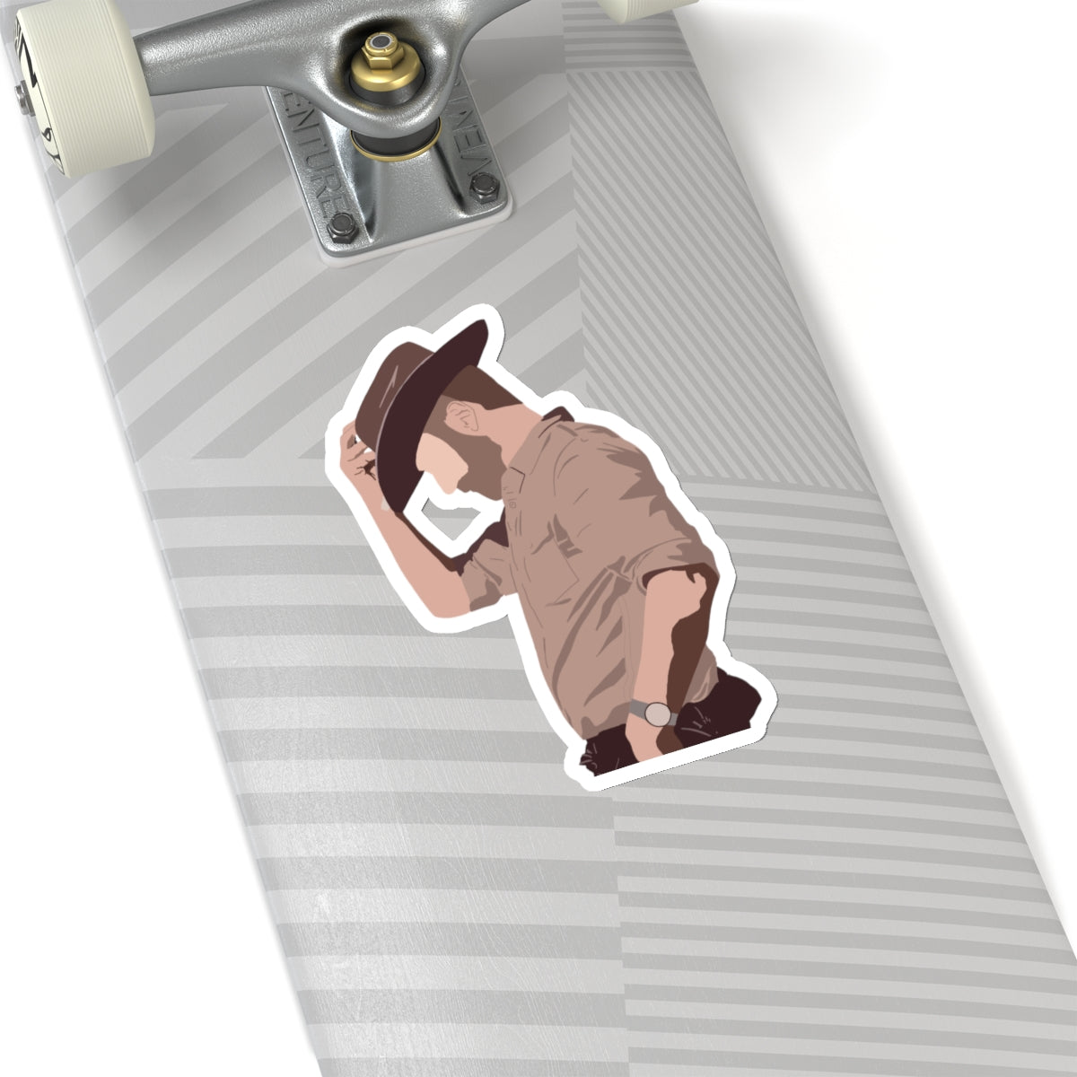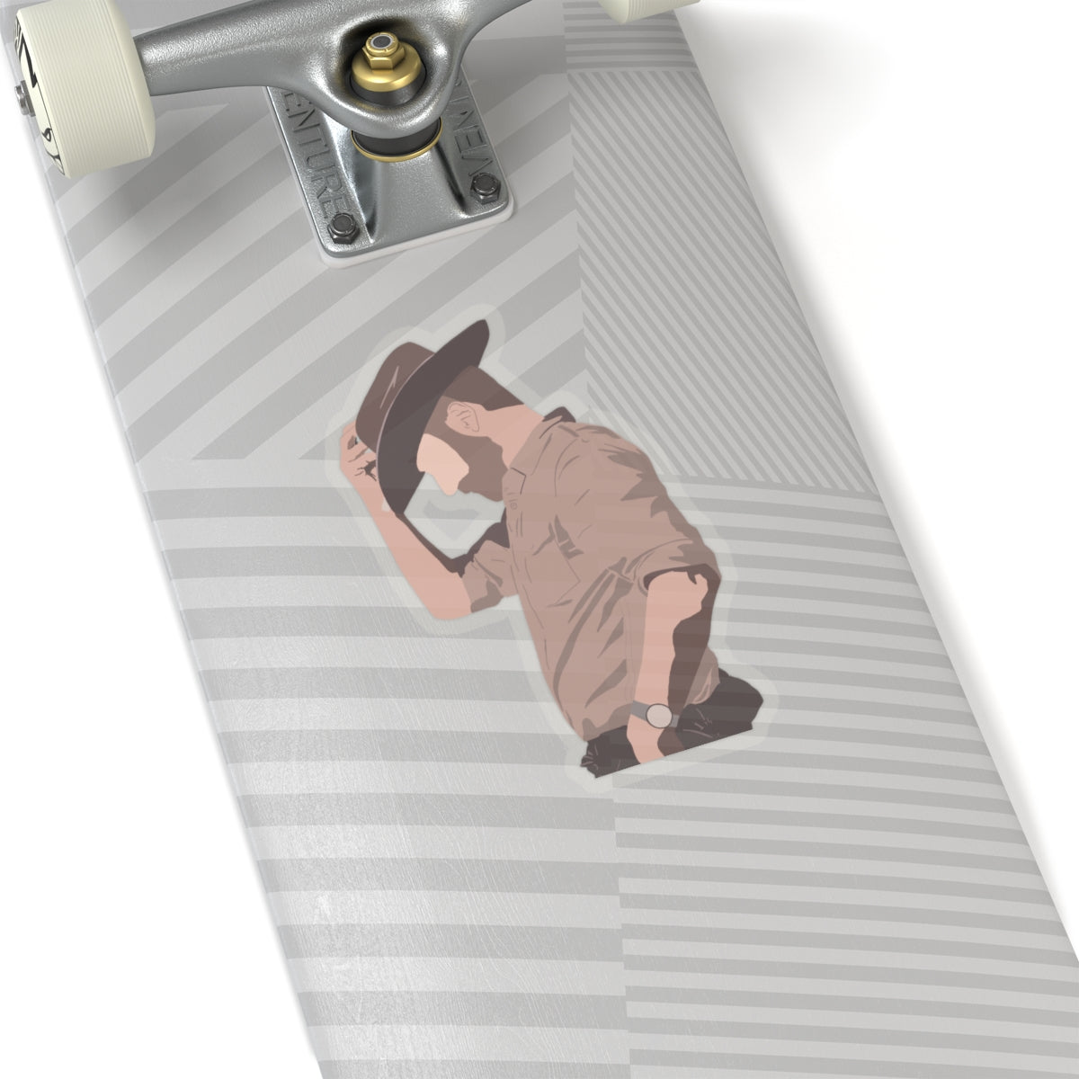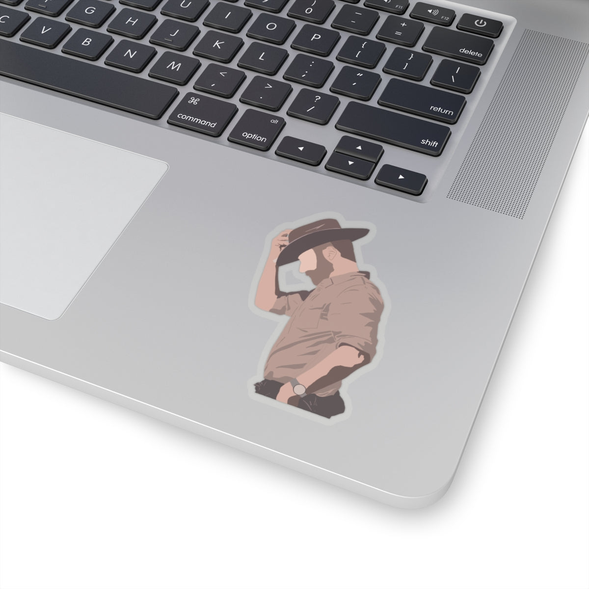The sticker features a captivating drawing of a man in a sheriff uniform. The man's head is slightly lowered, conveying a sense of weariness and solemnity. The sheriff stands tall, donning a weathered cowboy hat that sits firmly on his head, shielding his eyes from the harsh environment. With his right hand, the sheriff holds onto his hat, as if lost in contemplation or mourning the world that once was. The posture of his body speaks of a life filled with challenges and hardships, yet he remains steadfast and determined.