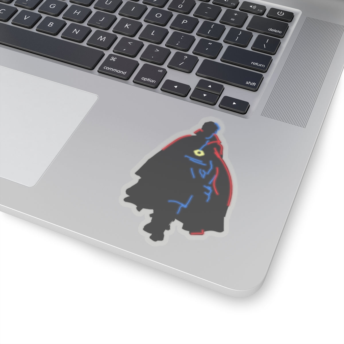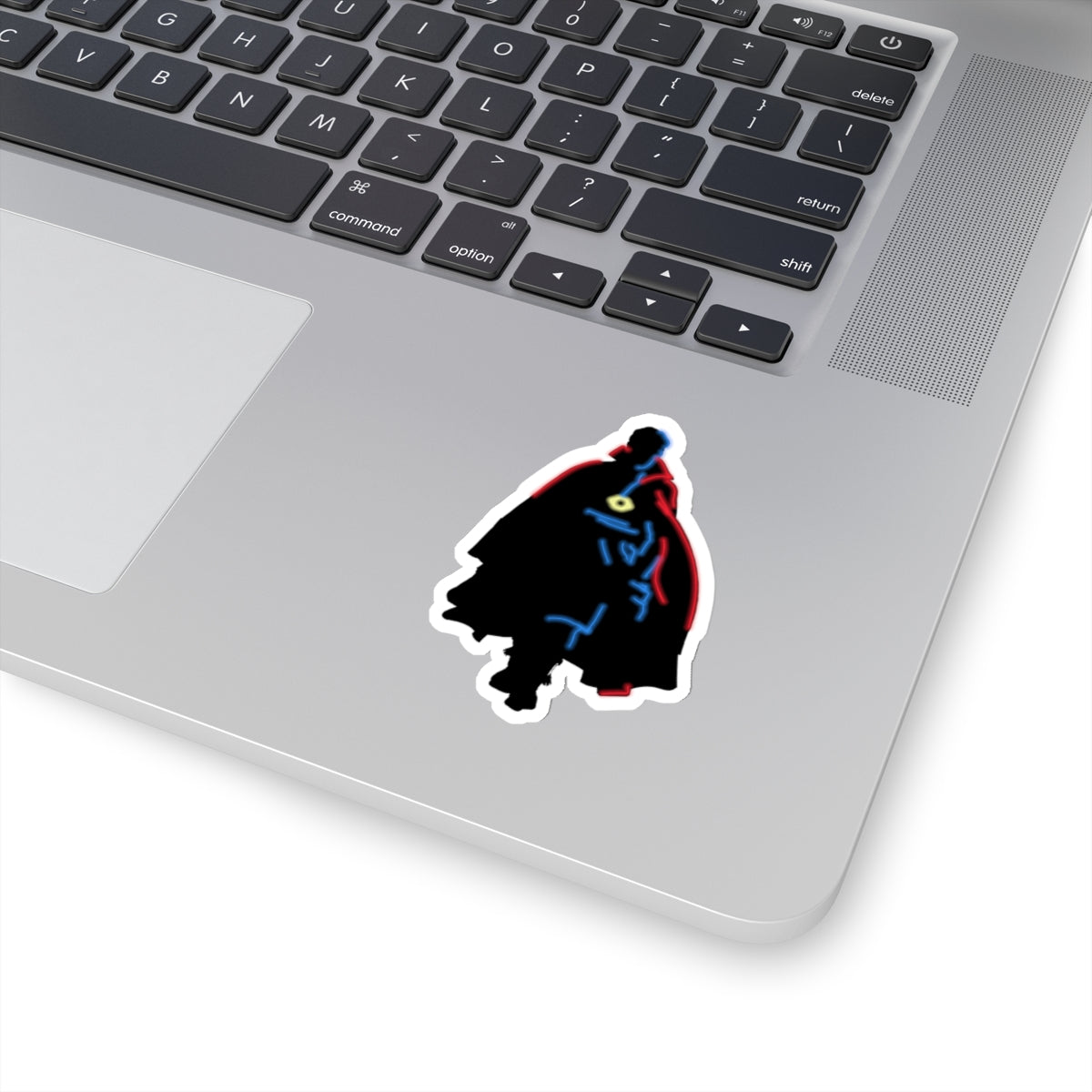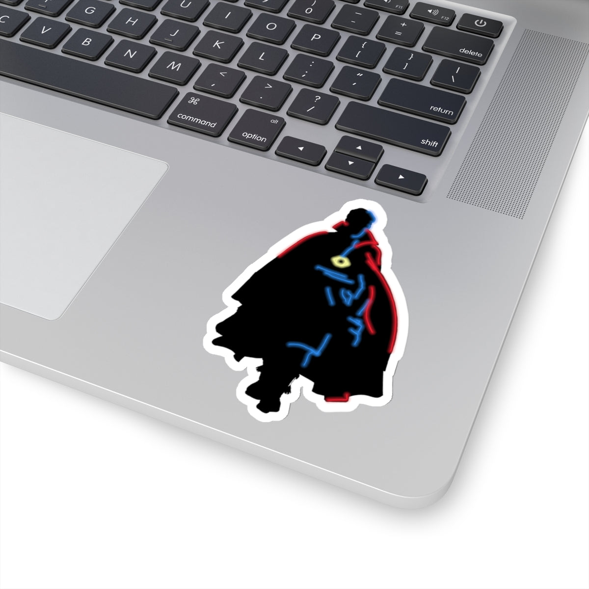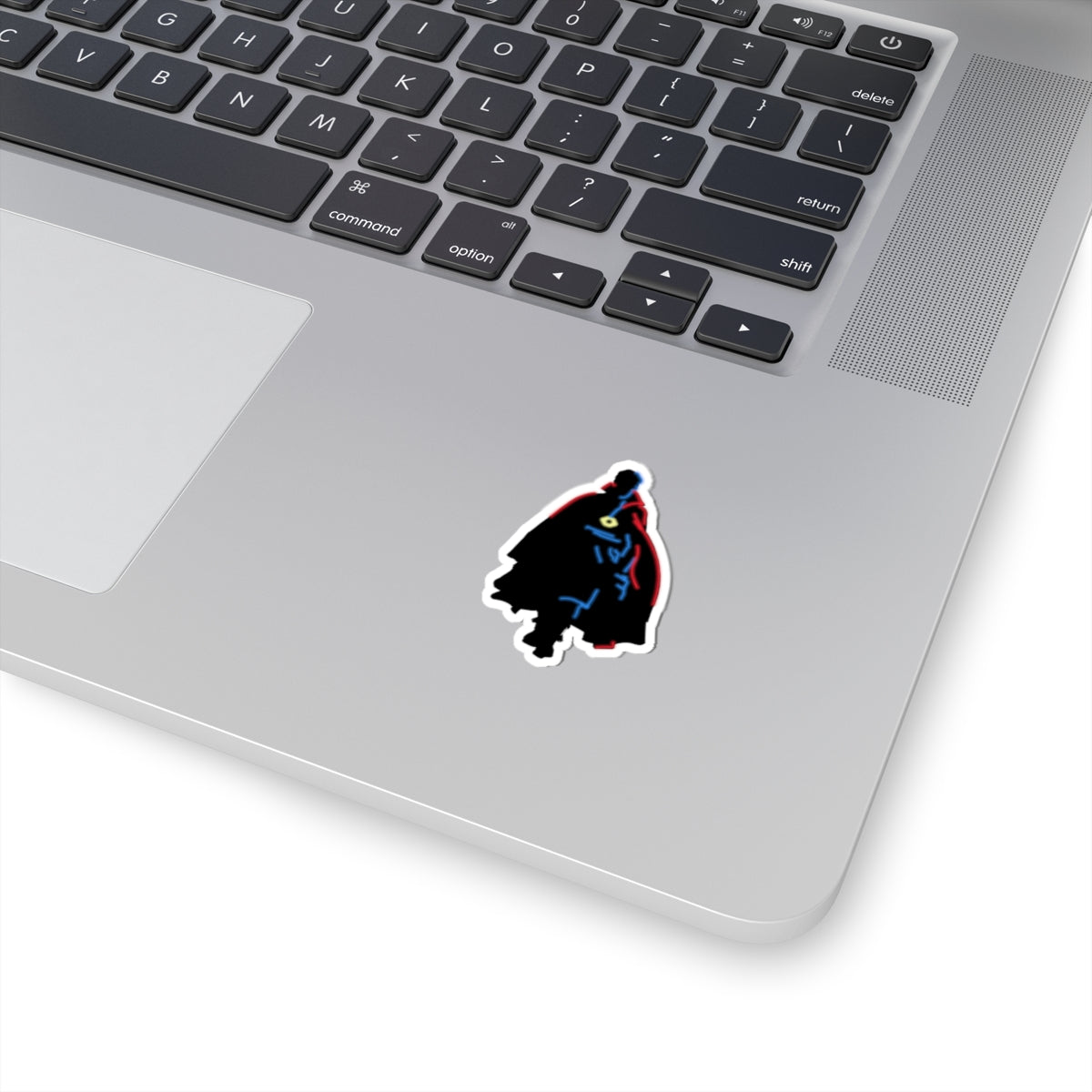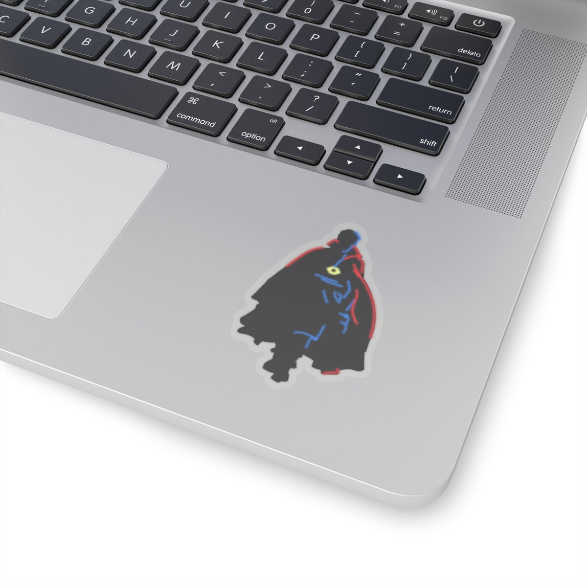This sticker features a captivating drawing of a silhouette of a magician. The magician stands tall and confident, showcasing an air of mystery and intrigue. The entire silhouette is a black background, creating a sharp and striking appearance. The magician is depicted wearing a flowing cape that cascades down from their shoulders, adding a sense of drama to the composition. The cape and outline of the magician are specifically highlighted in shades of blue and red. These colors intermingle seamlessly, creating an eye-catching contrast against the dark background.