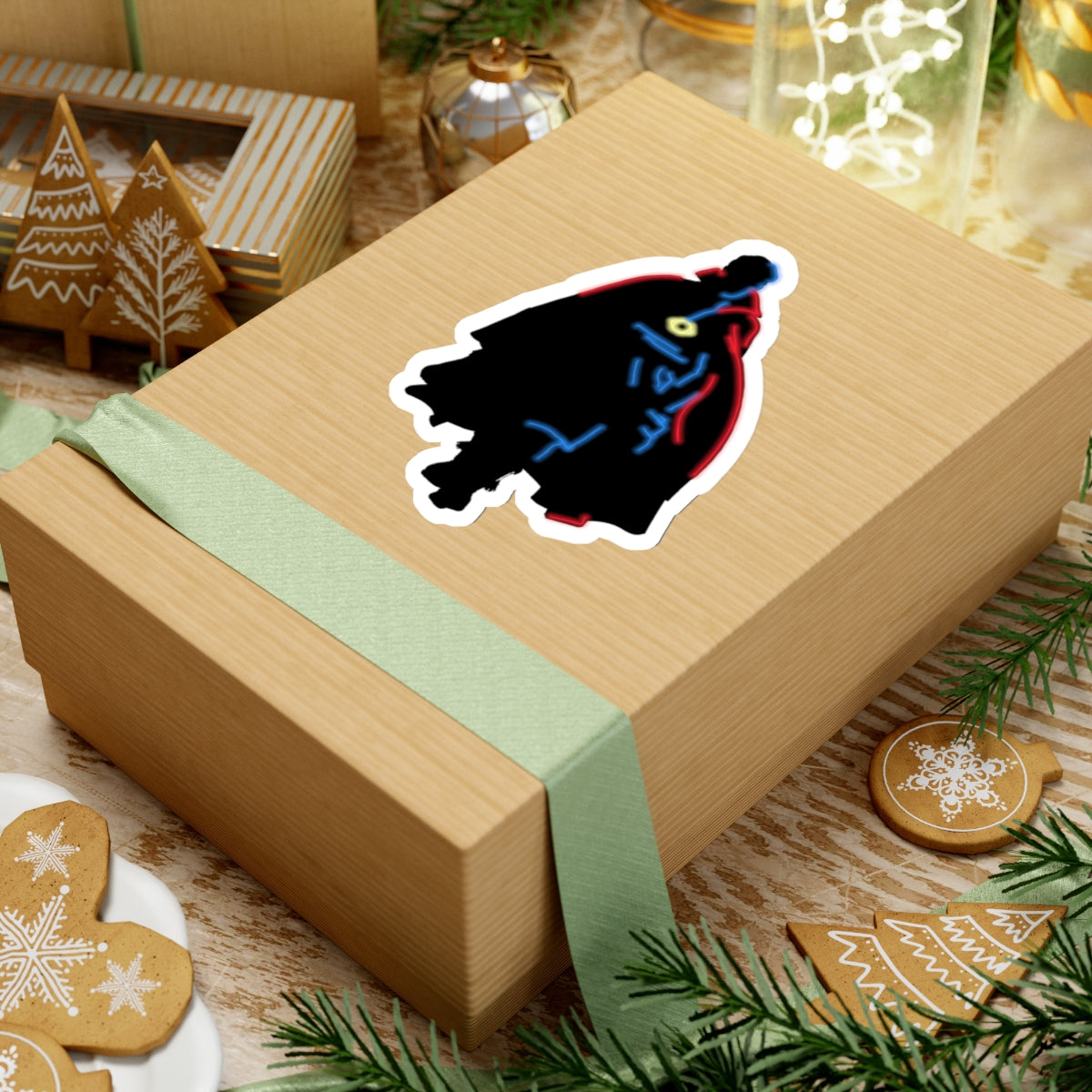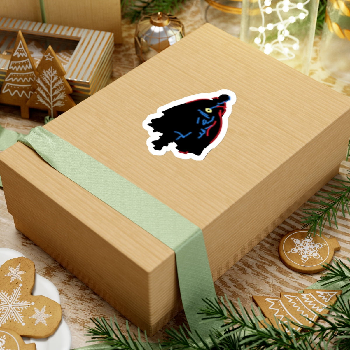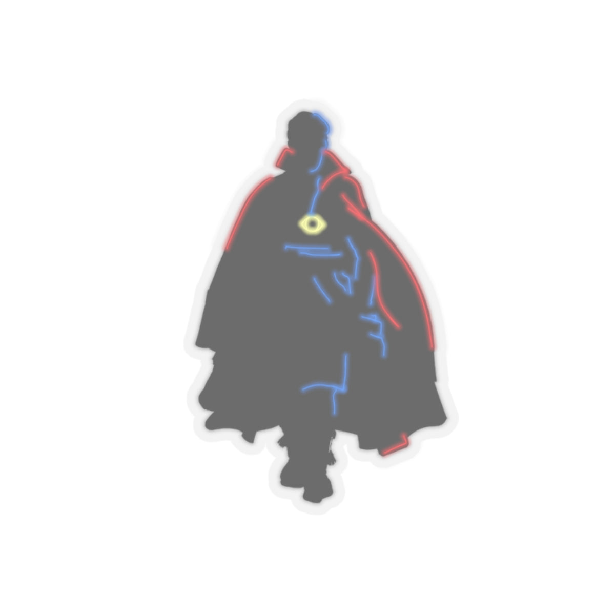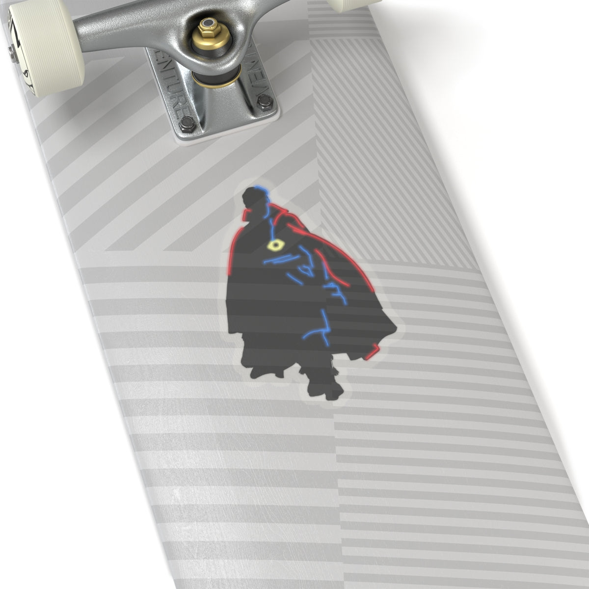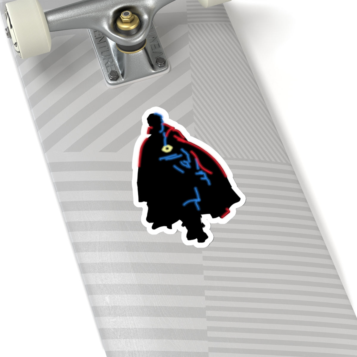 This sticker features a captivating drawing of a silhouette of a magician. The magician stands tall and confident, showcasing an air of mystery and intrigue. The entire silhouette is a black background, creating a sharp and striking appearance. The magician is depicted wearing a flowing cape that cascades down from their shoulders, adding a sense of drama to the composition. The cape and outline of the magician are specifically highlighted in shades of blue and red. These colors intermingle seamlessly, creating an eye-catching contrast against the dark background.