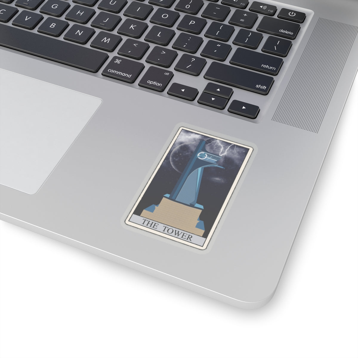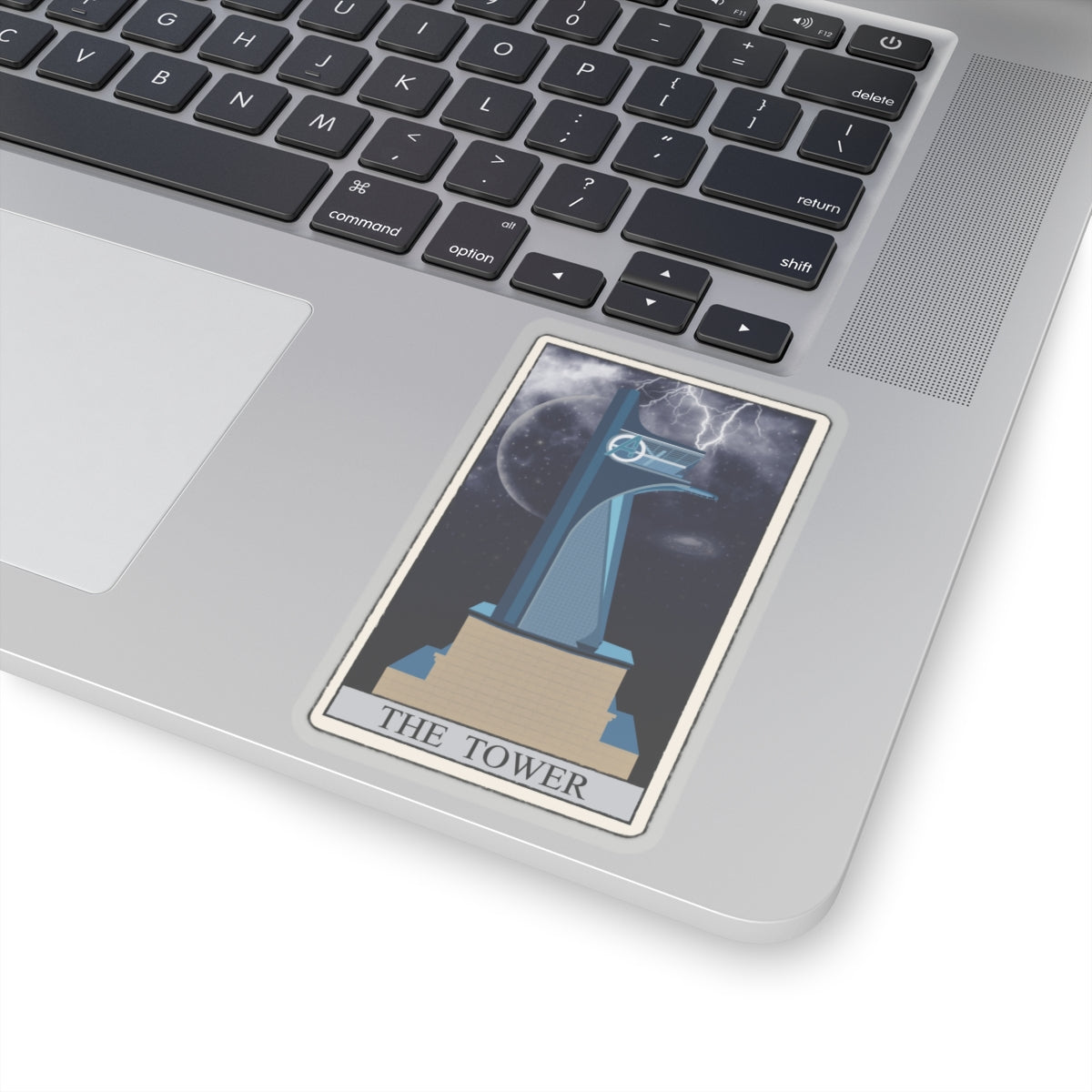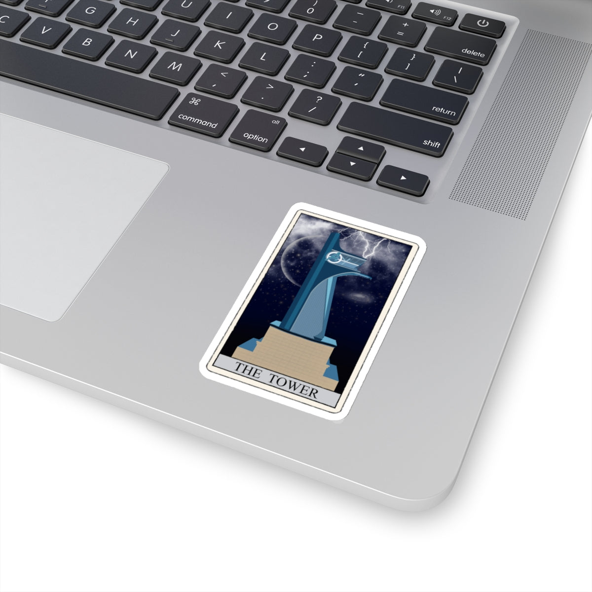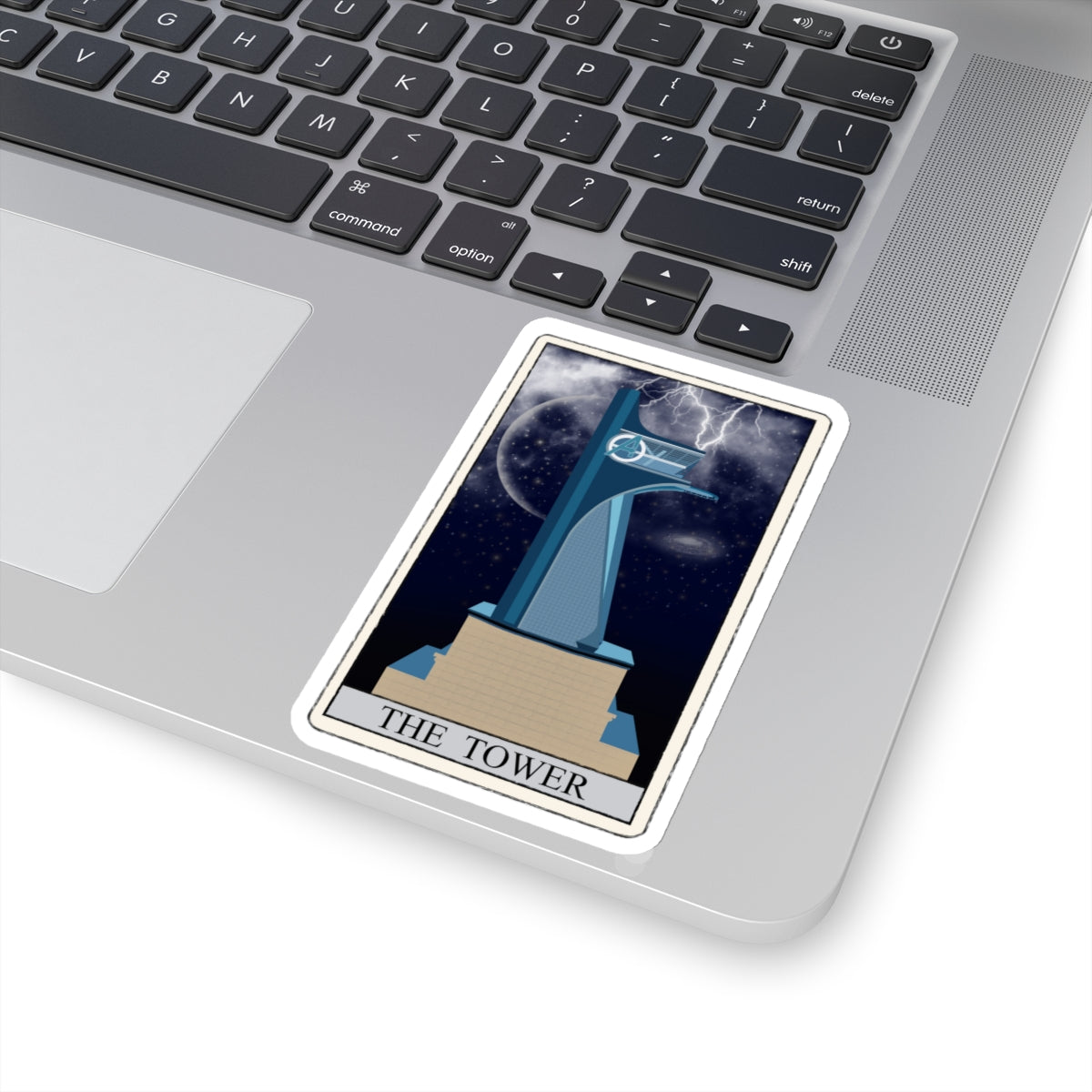 The overall effect of the sticker is powerful and dramatic, capturing the essence of the tarot card's meaning. The background of the sticker is a dark, stormy blue to give the impression of a dark and ominous sky.