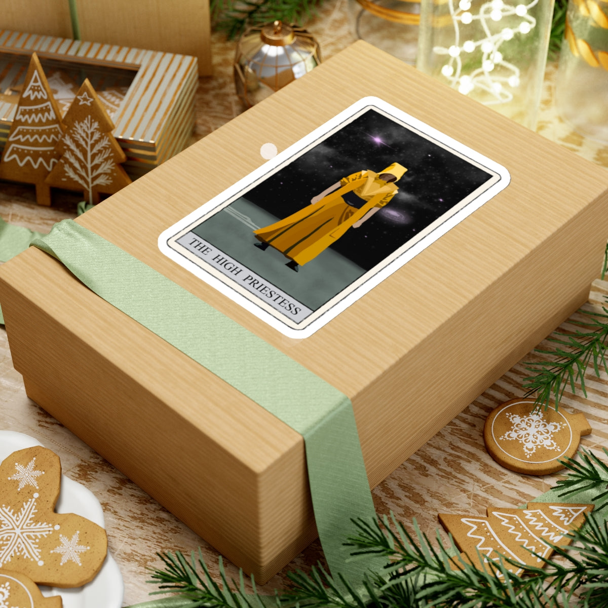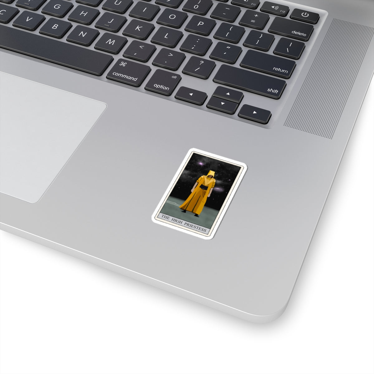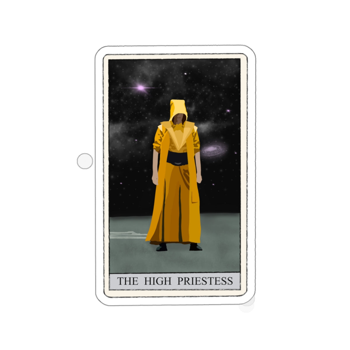 Embrace the mystery and wisdom of the tarot with our beautifully designed High Priestess sticker. Featuring a mystical, ancient figure draped in a flowing yellow robe, set against a mesmerizing starry night sky with visible stars and planets, this sticker is perfect for adding a touch of magic to your personal items.