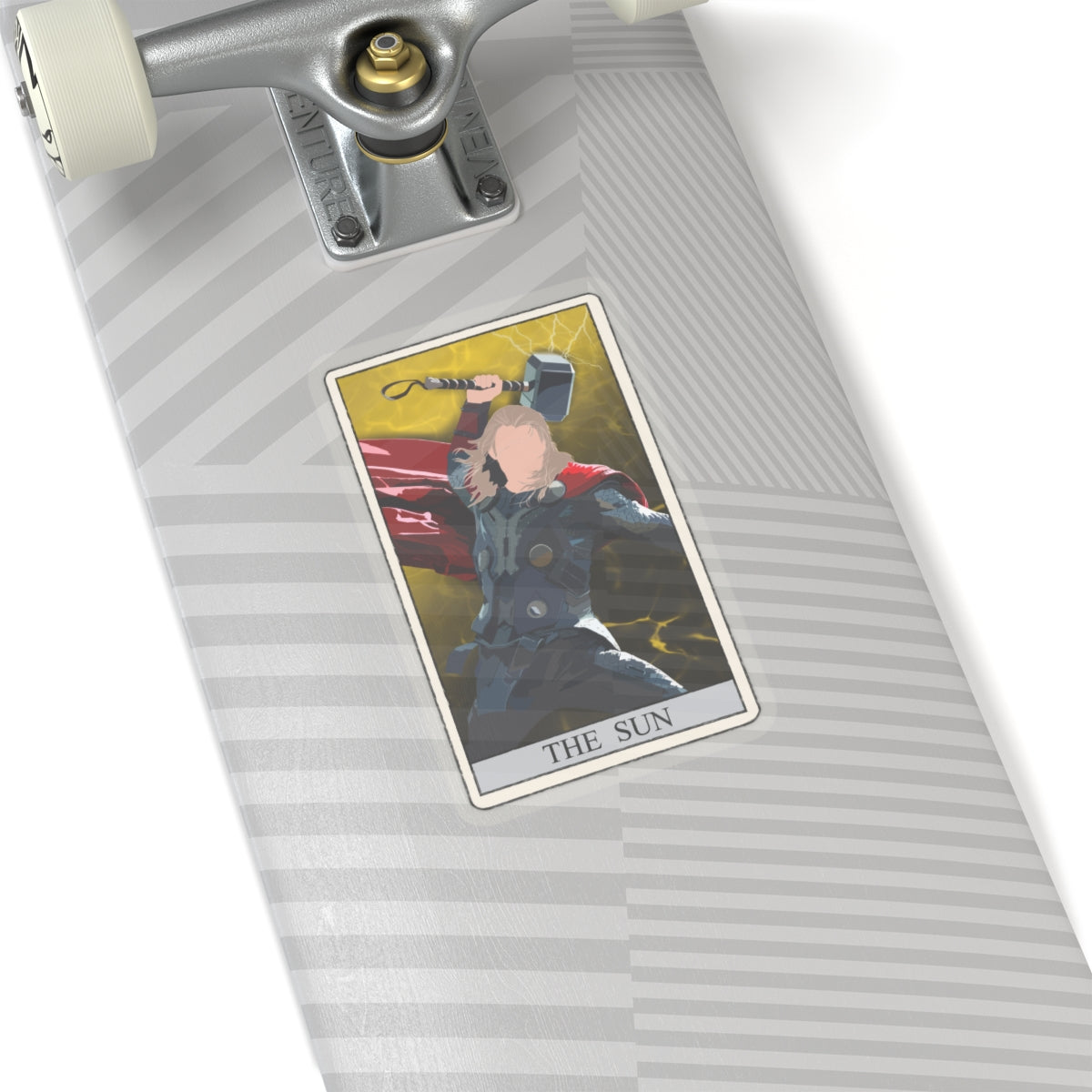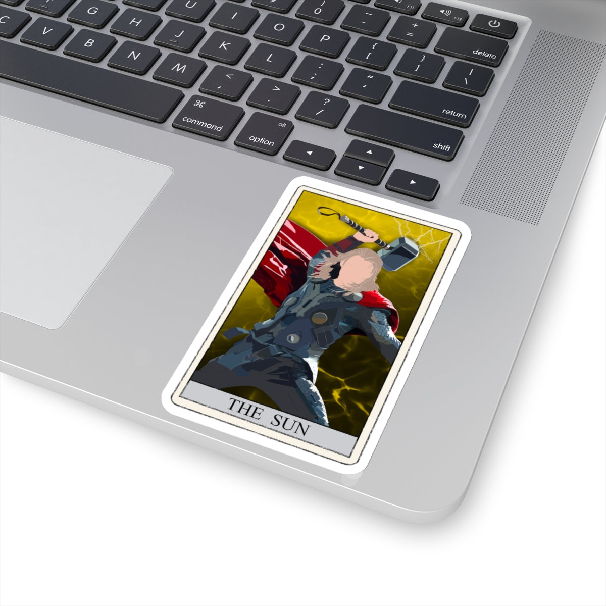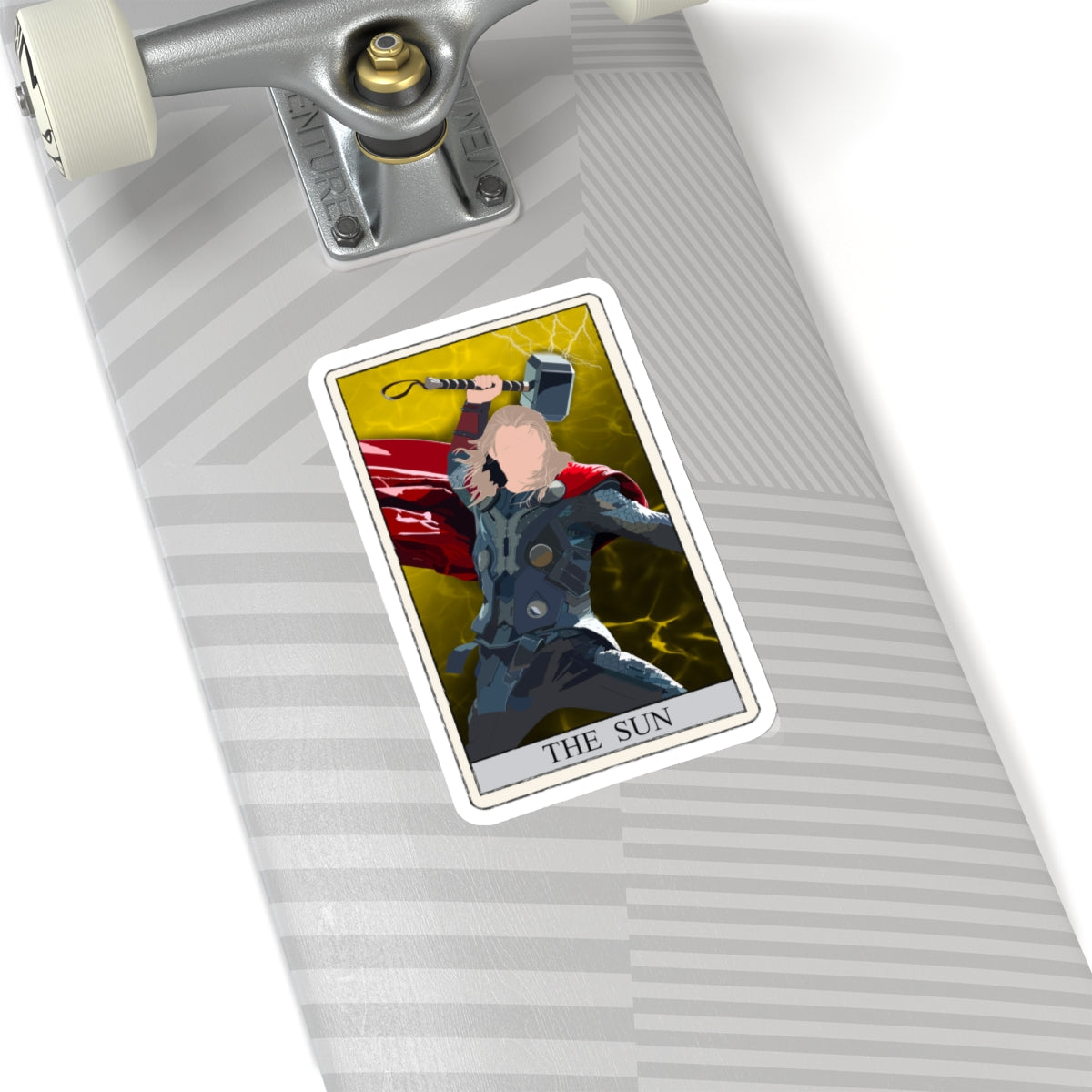 This unique sticker features a striking reinterpretation of the classic tarot card, The Sun, showcasing a formidable Nordic figure wielding a mighty war hammer. Set against a vibrant yellow background with dynamic lightning strikes, this design symbolizes strength, enlightenment, and triumph.