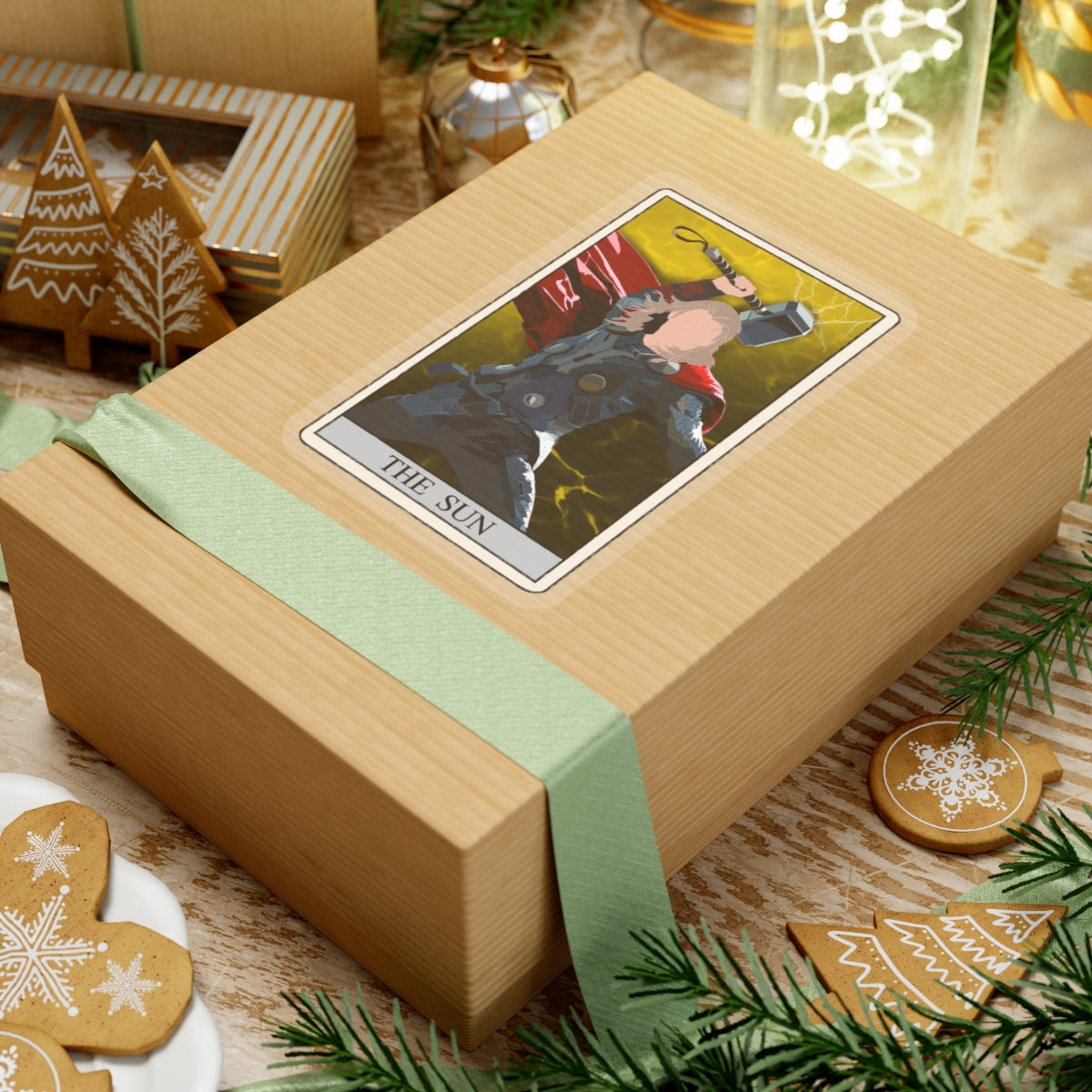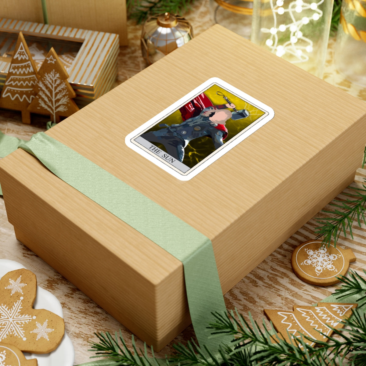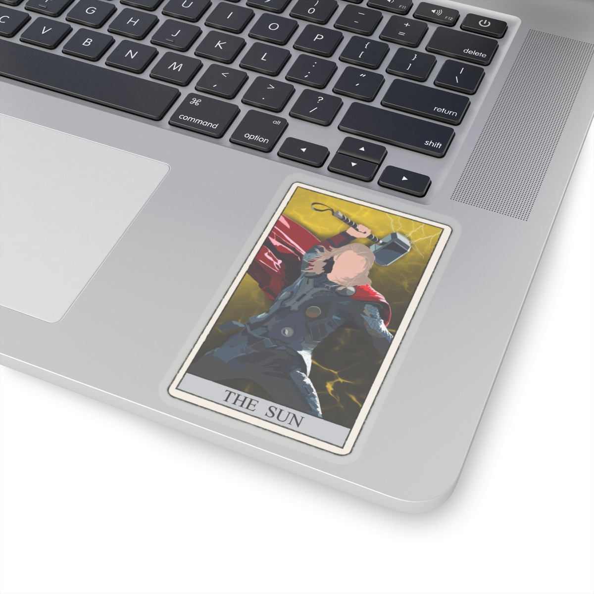 This unique sticker features a striking reinterpretation of the classic tarot card, The Sun, showcasing a formidable Nordic figure wielding a mighty war hammer. Set against a vibrant yellow background with dynamic lightning strikes, this design symbolizes strength, enlightenment, and triumph.