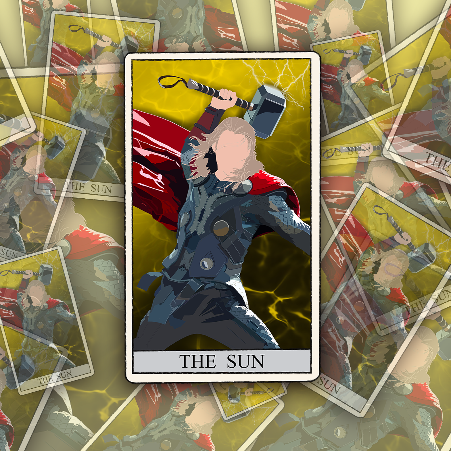 Overall, this tarot card is a dynamic and dramatic depiction of a hero wielding the power of thunder and lightning. While it may not fit the traditional symbolism of the Sun card, it could still be a powerful image for those who resonate with the themes of strength, power, and heroism.
