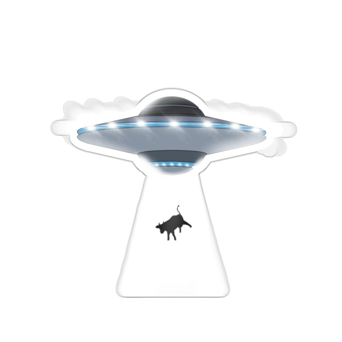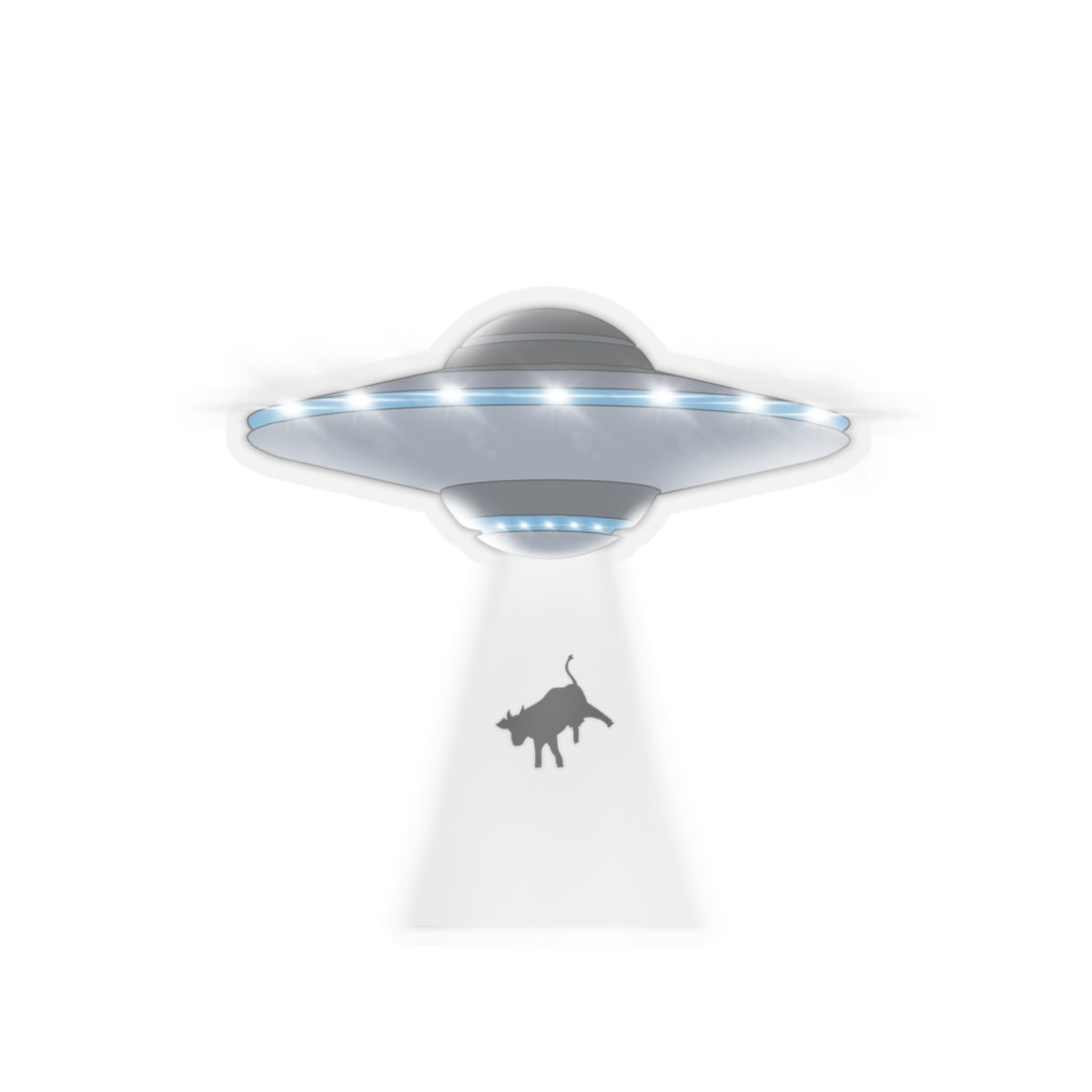 Transform any surface into an extraterrestrial spectacle with this sticker. Featuring a whimsical UFO with mesmerizing shining lights, this design captures the mystery and wonder of close encounters. The scene unfolds as the UFO deploys its iconic tractor beam to gently lift a cute cow into the unknown, adding a touch of humor to your collection. An attention-grabbing sticker that sparks curiosity and imagination.