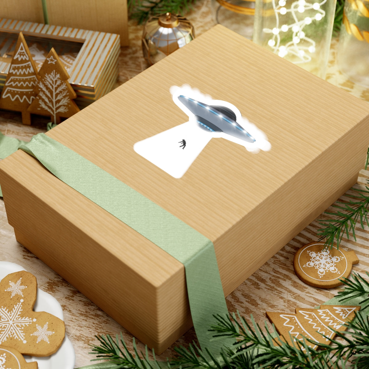 The scene unfolds as the UFO deploys its iconic tractor beam to gently lift a person into the unknown, adding a touch of humor to your collection. An attention-grabbing sticker that sparks curiosity and imagination.